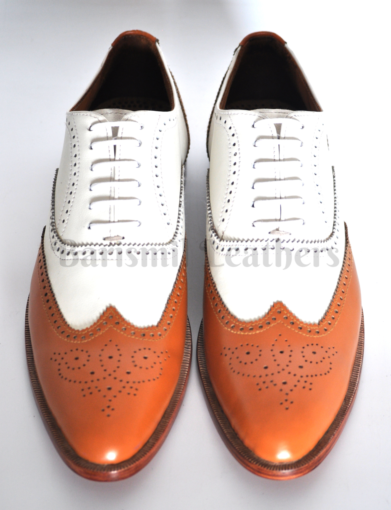 Handmade leather oxford wingtip and brogue lace up white and brown leather men dress custom shoe.