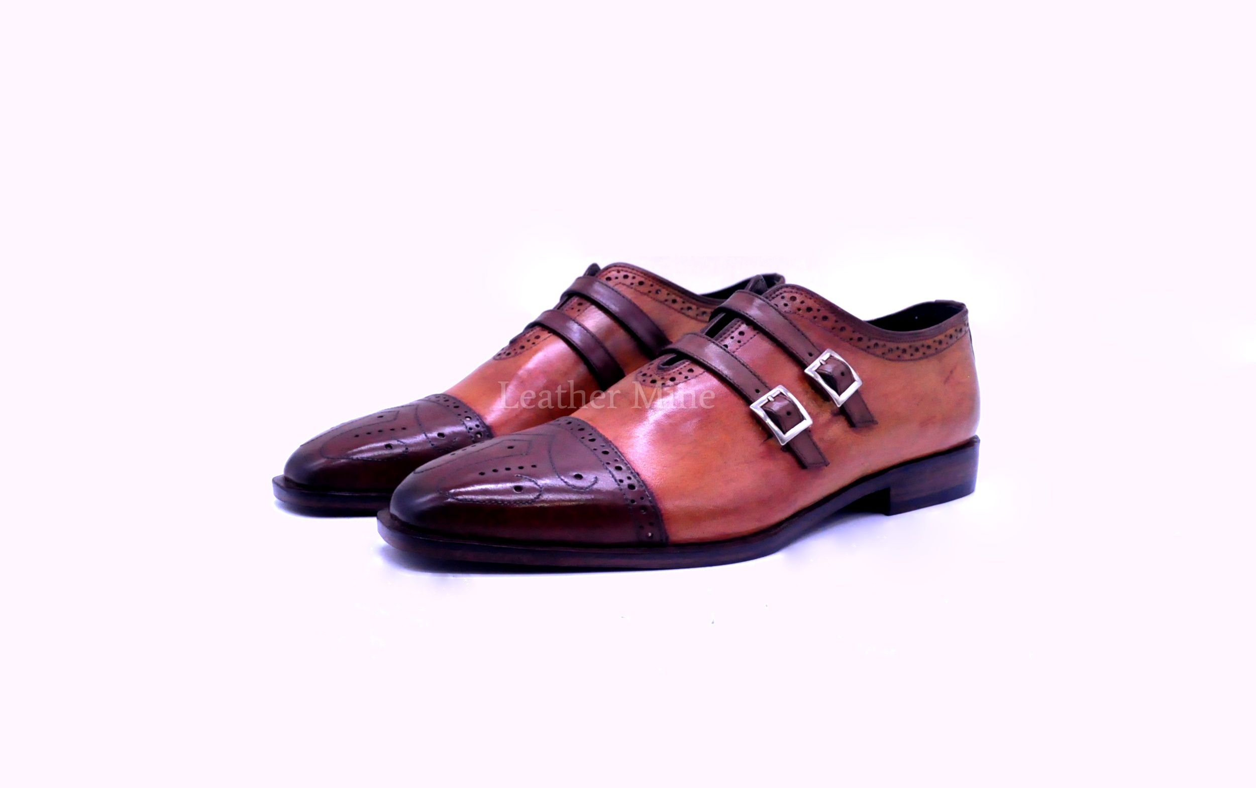 Tan Patina Double Monk Dress Shoes Men, Handmade Leather Shoes Men