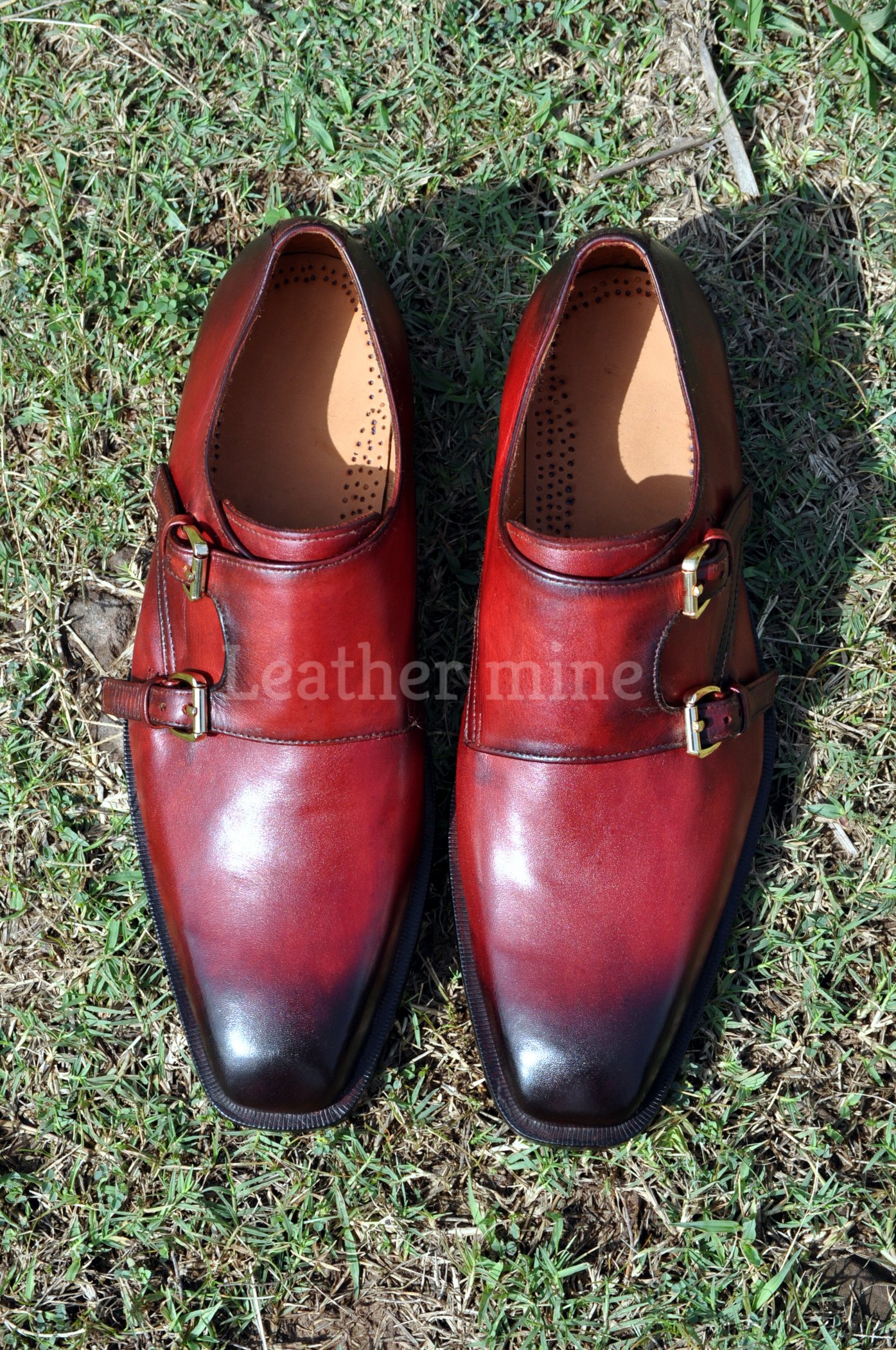 Handmade Red Patina Double Monk Strap Leather Shoes Men', Formal Shoes