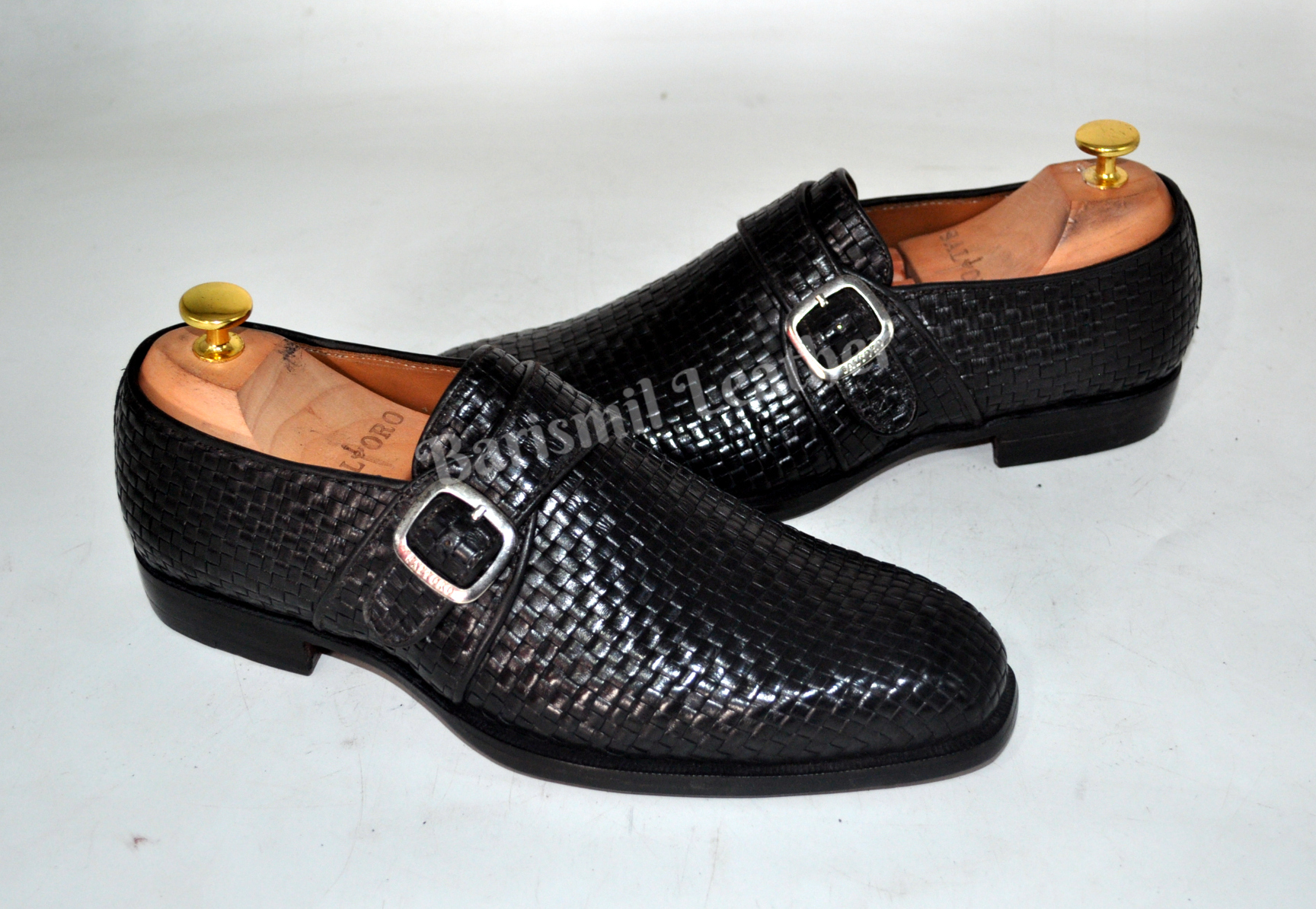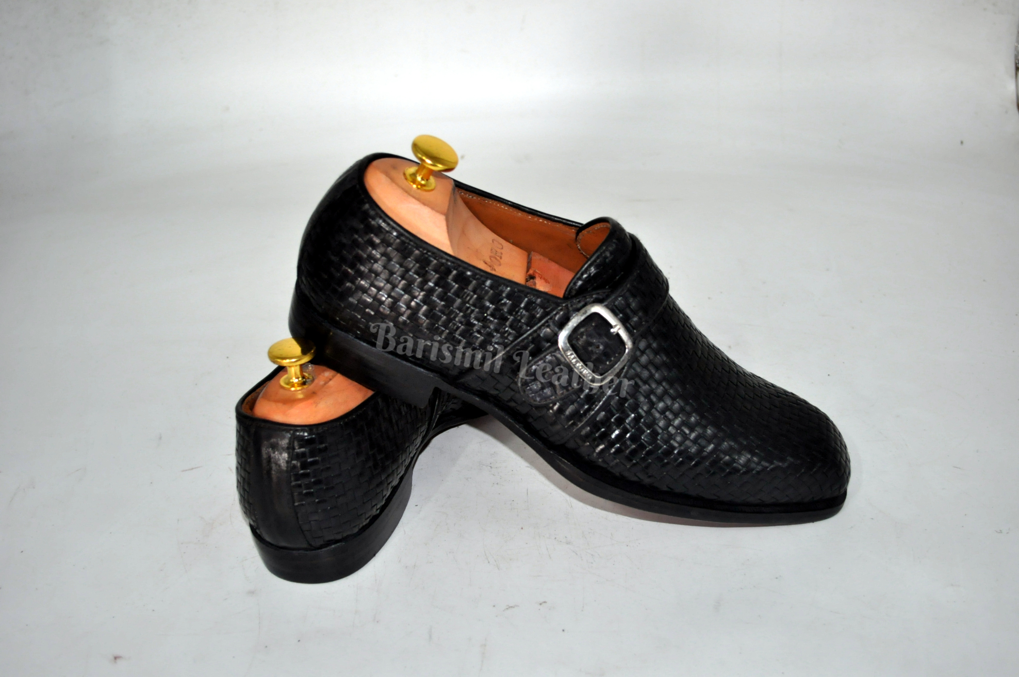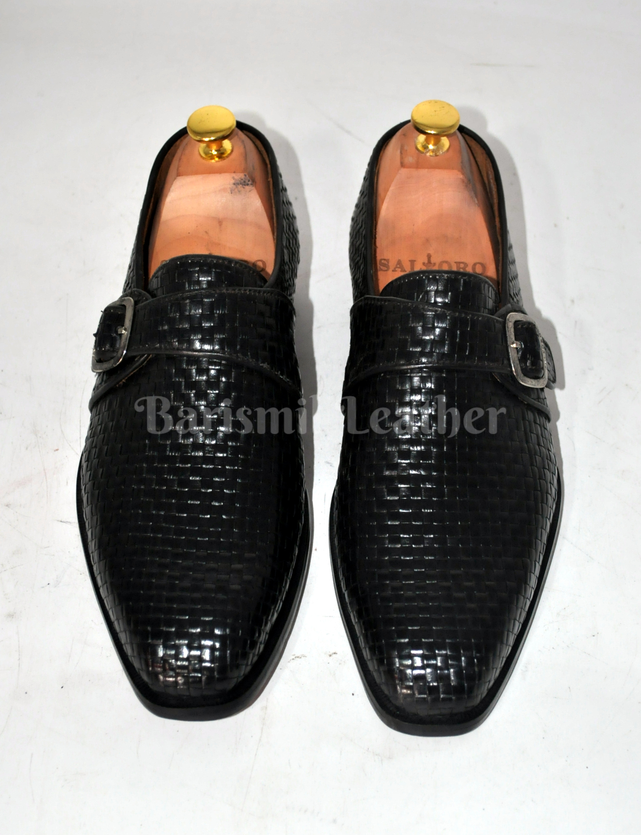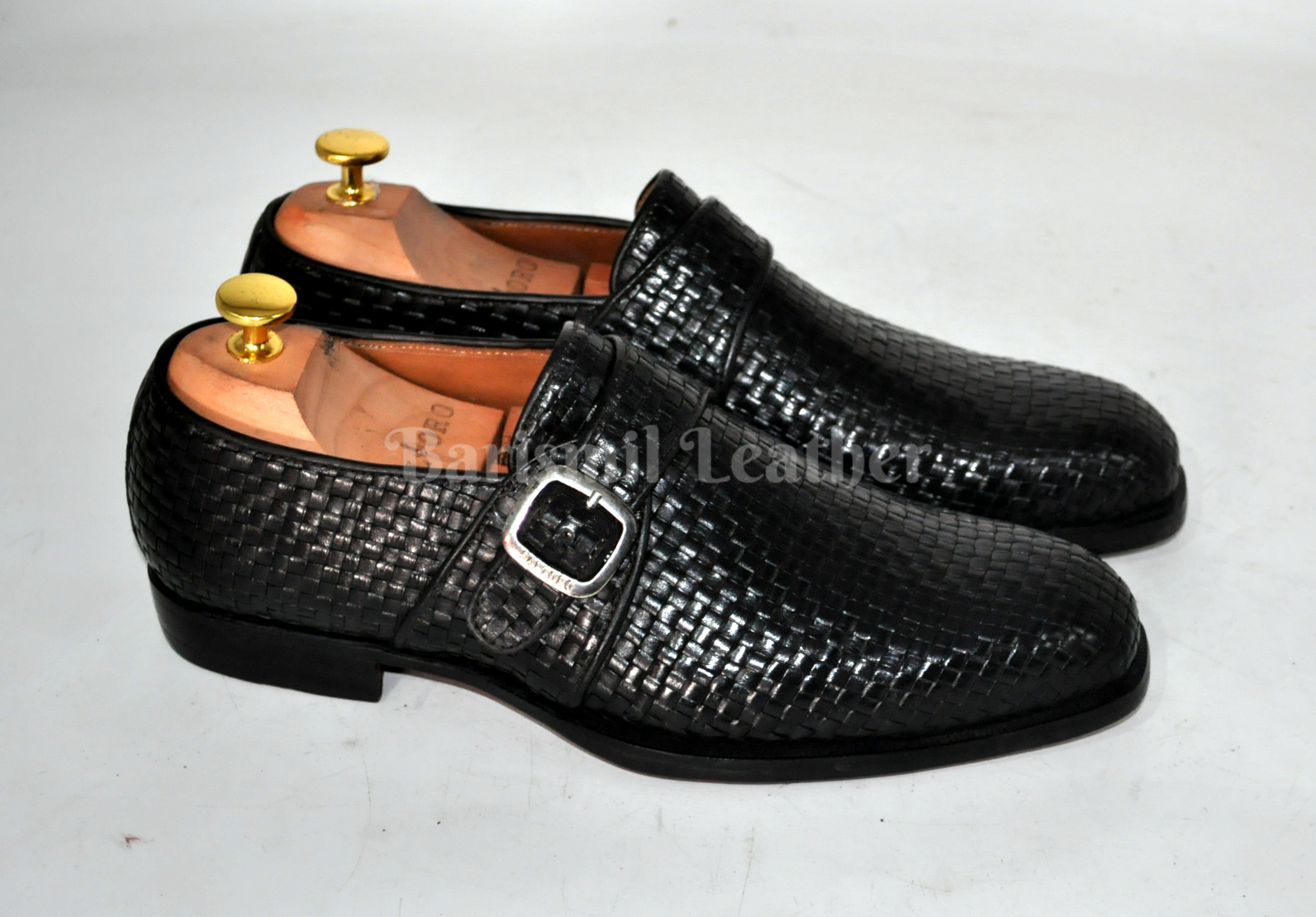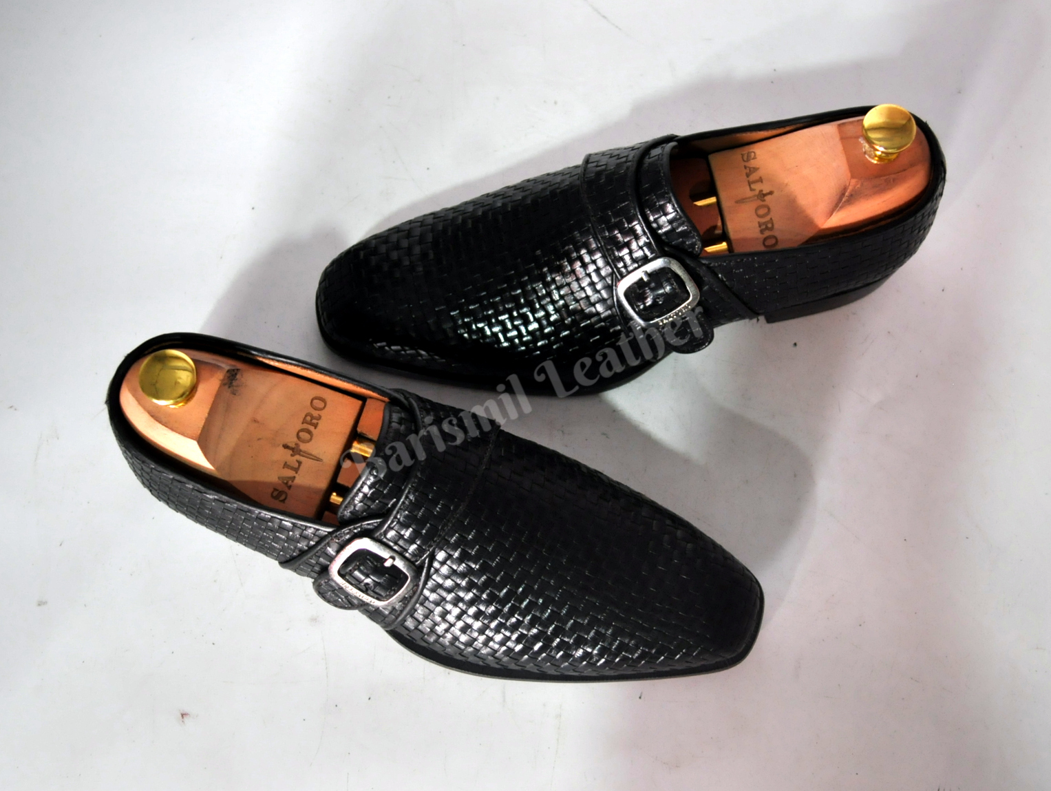 Handmade Black Woven Leather Monk strap Shoes Leather Dress Shoes for Men Formal Shoes