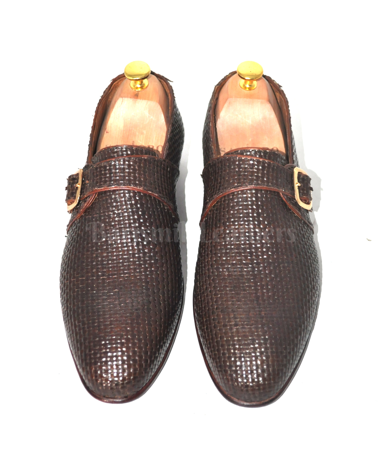 Handmade monk strap brown woven leather men dress shoes, custom made on orders shoes