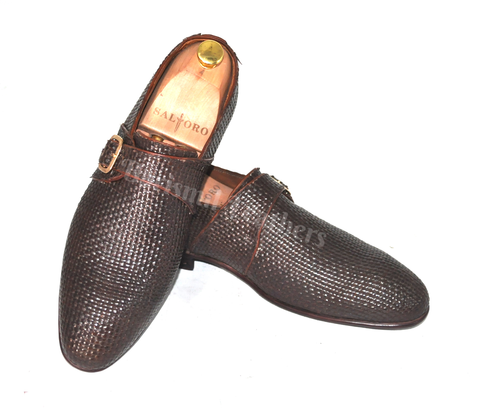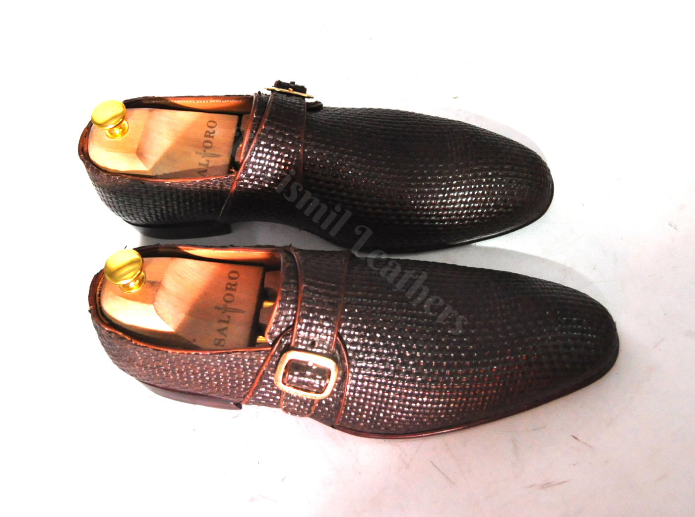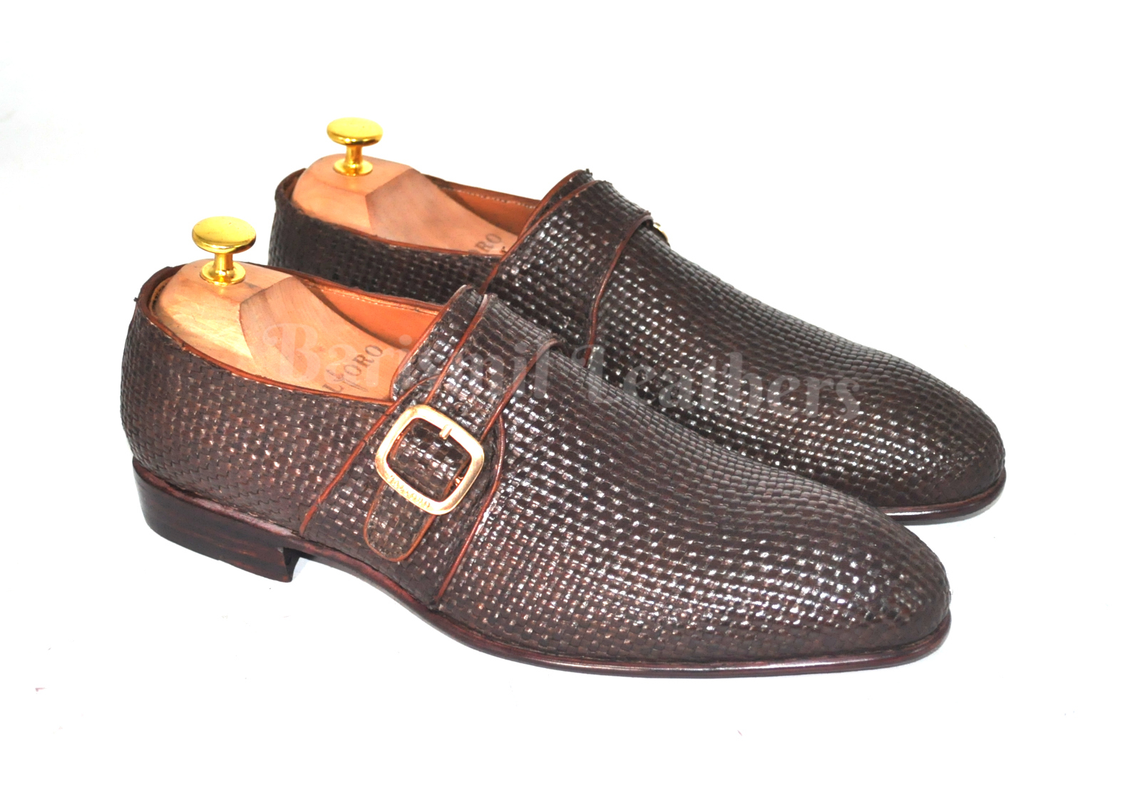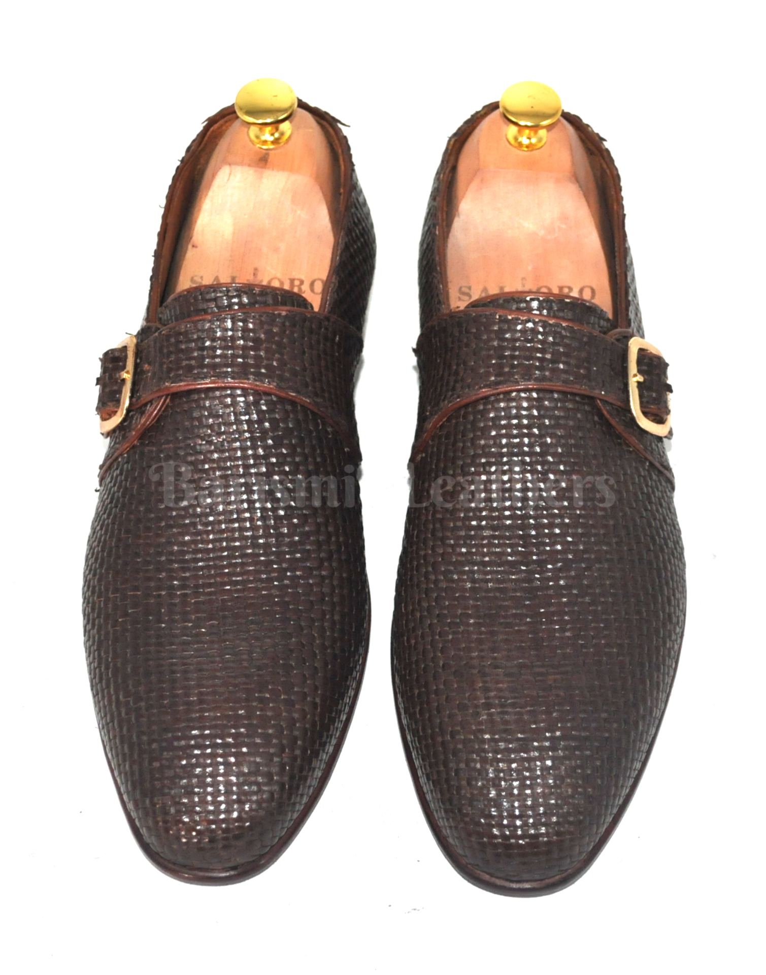 Handmade monk strap brown woven leather men dress shoes, custom made on orders.