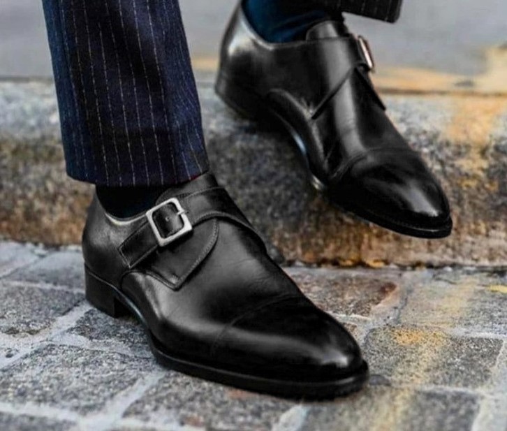 Handmade leather monk strap shoes black toe cap leather men dress formal shoes.
