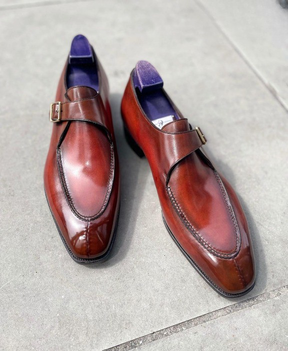 Handmade leather monk strap shoes brown patina original leather monk strap dress shoes for men.