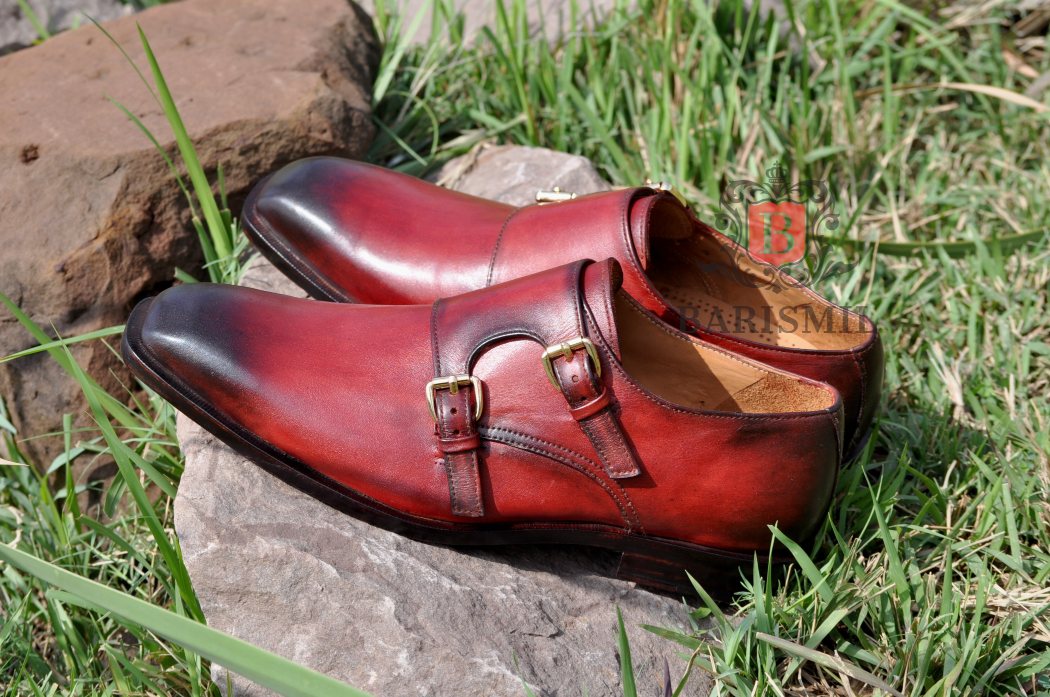 New handmade leather double monk strap shoes burgundy patina monk shoes for men original leather custom made shoes