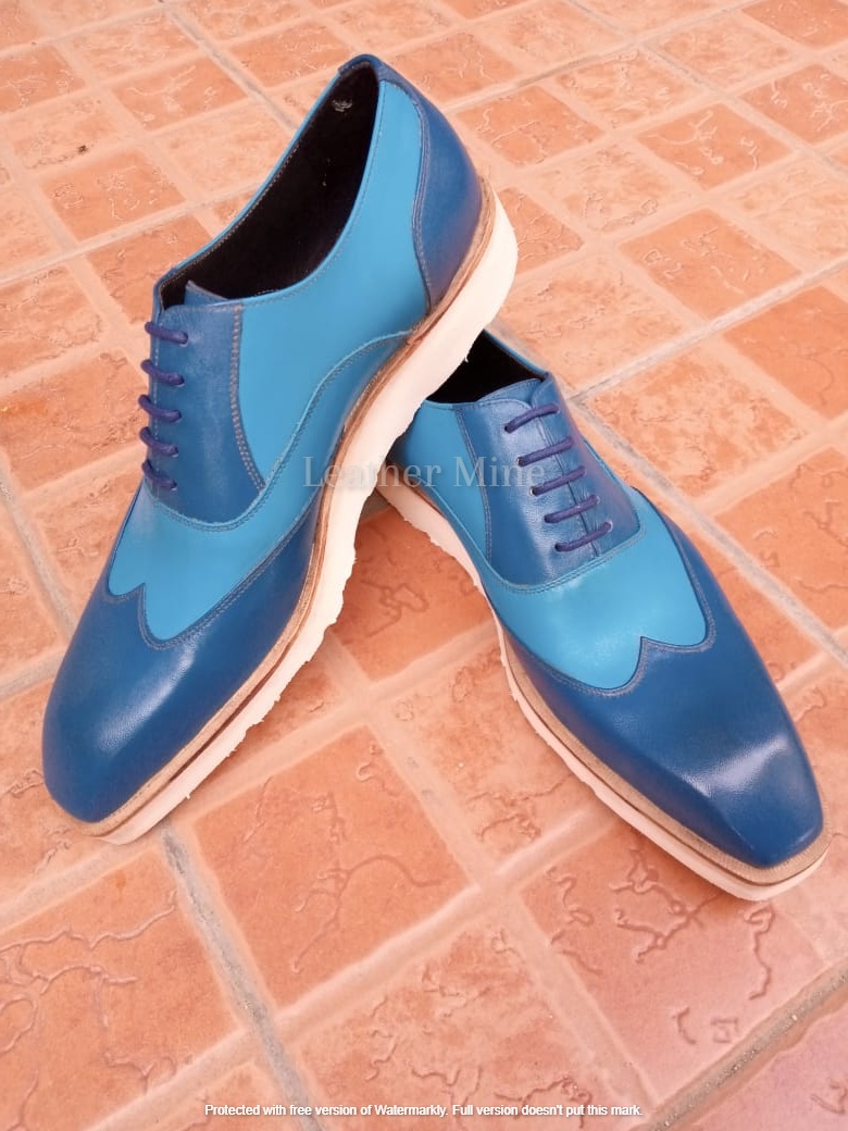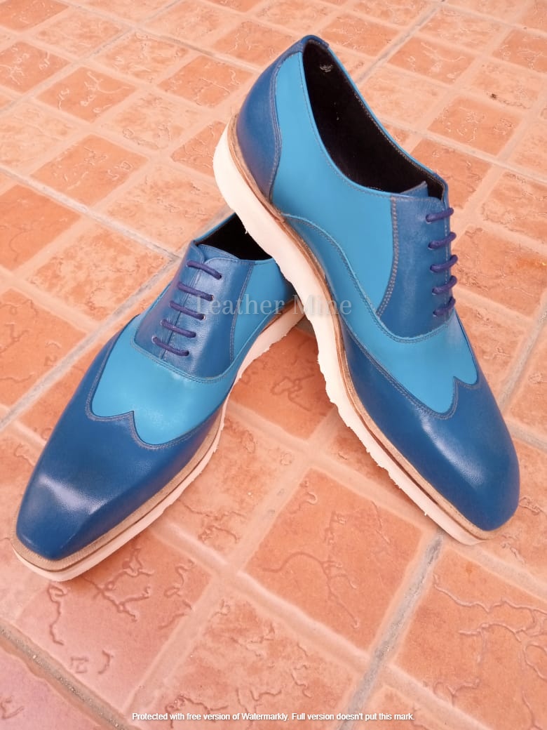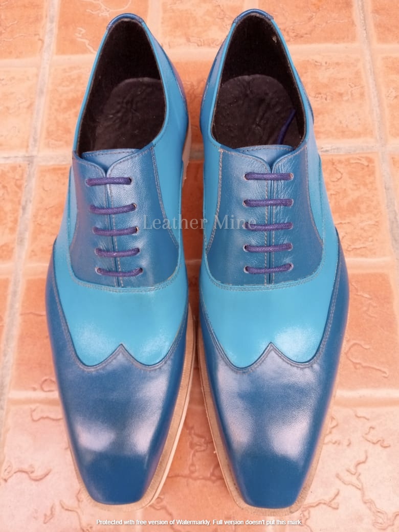 Leather Blue Wingtip shoes Men's, Handmade Formal Custom Shoes
