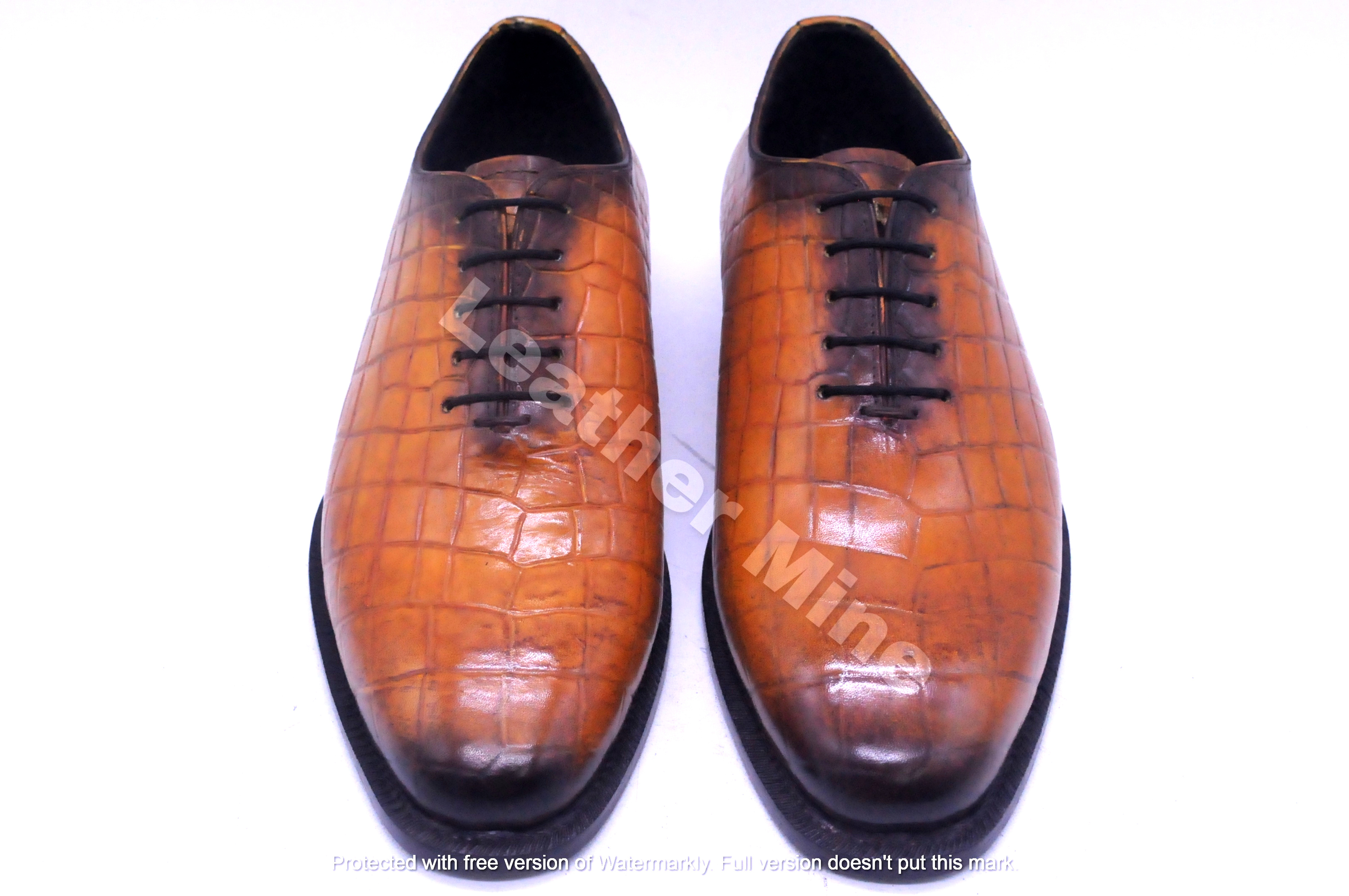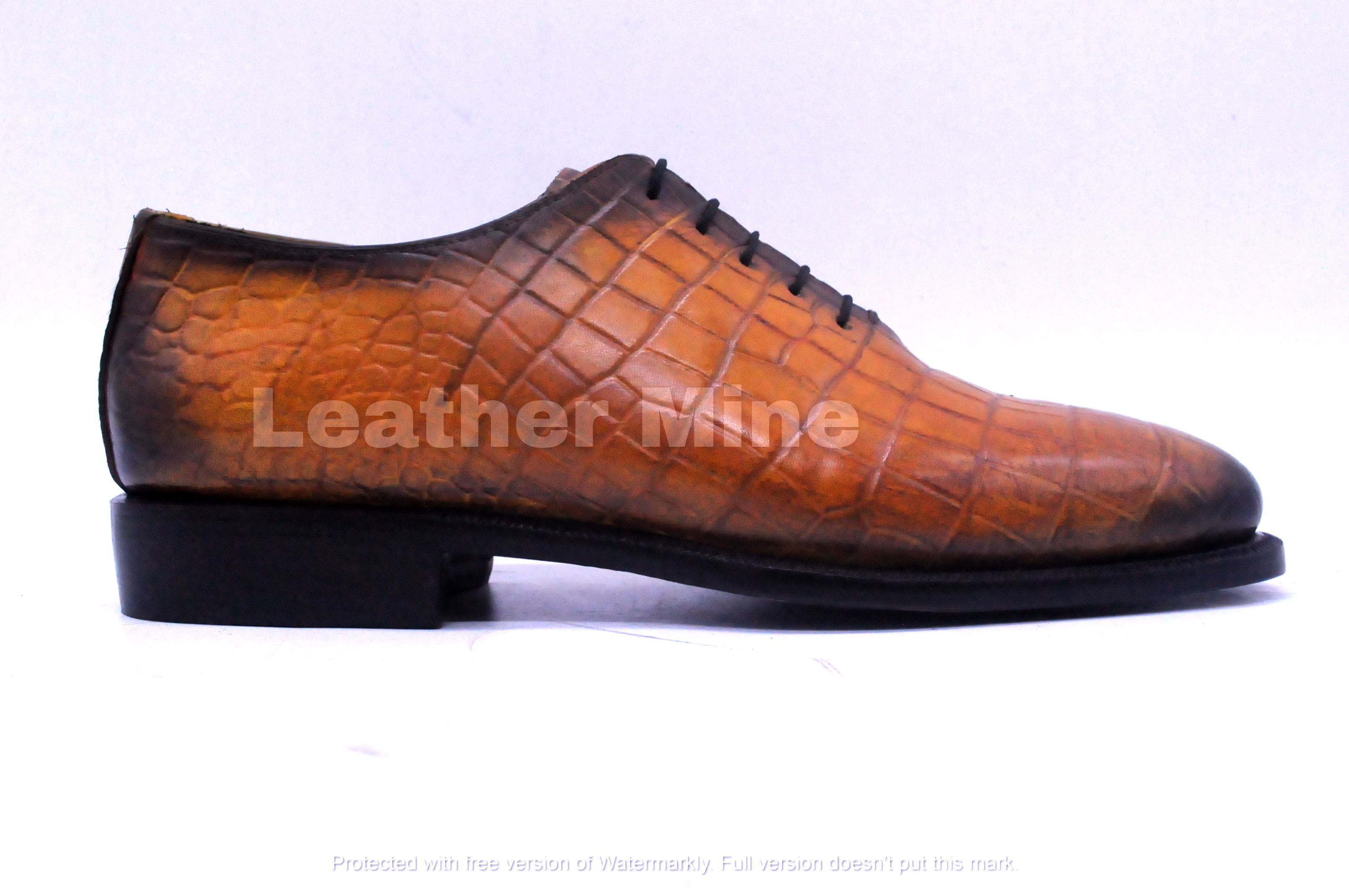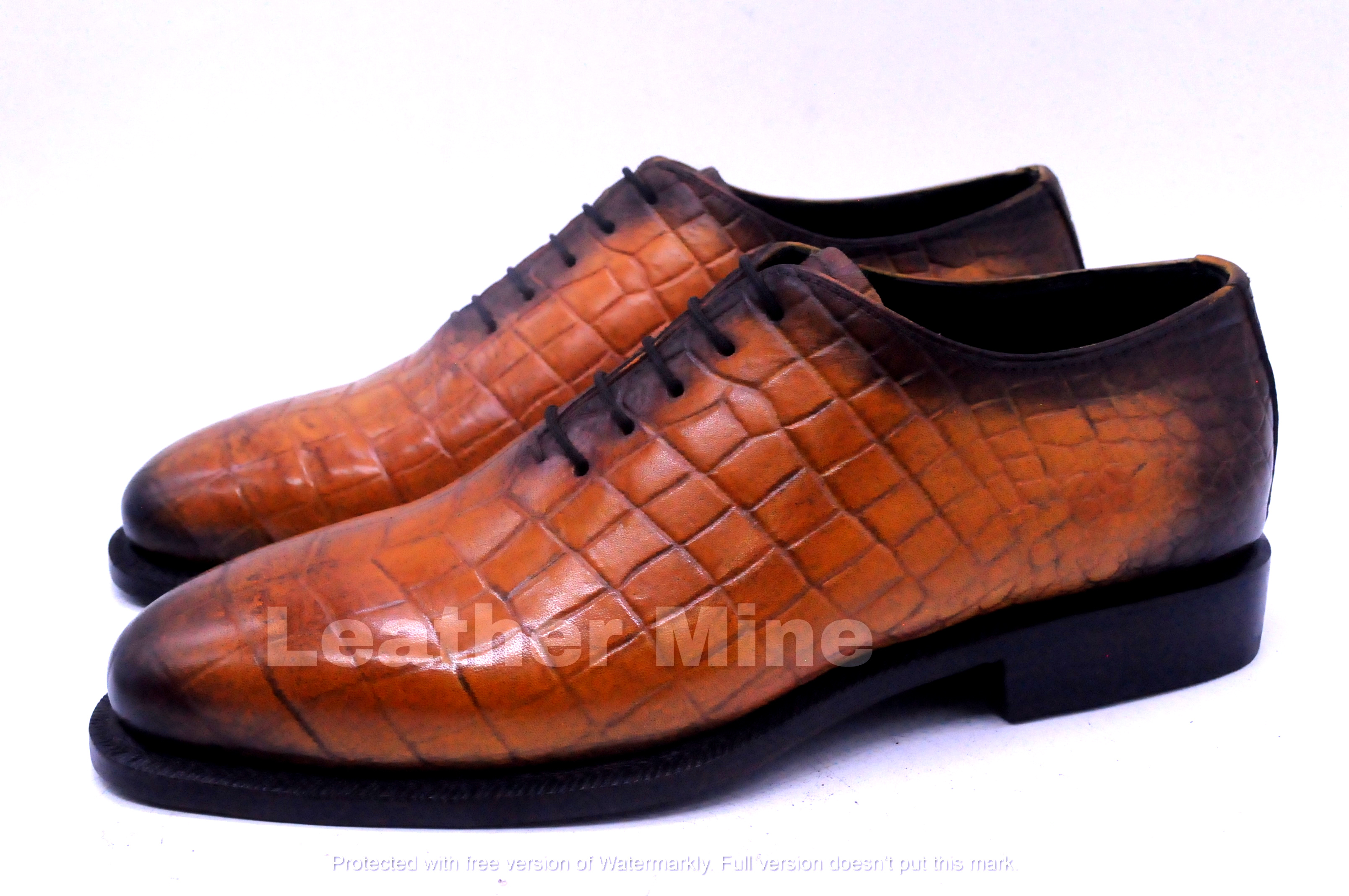 Handmade One Piece Whole Cut Crocodile Impression Leather Patina Oxfords Leather Dress Shoes For Men