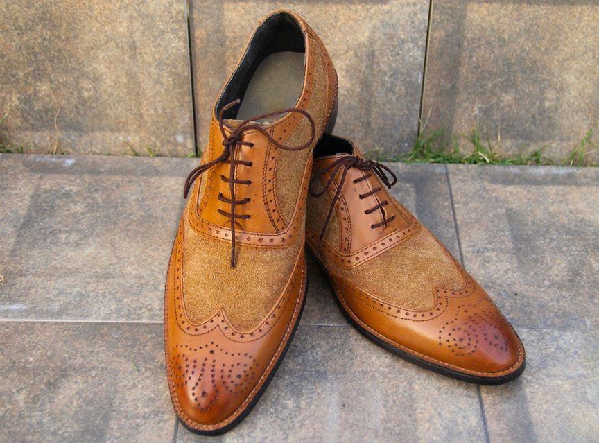Handmade lace up leather tan patina wingtip and brogue two tone dress men leather oxfords shoes