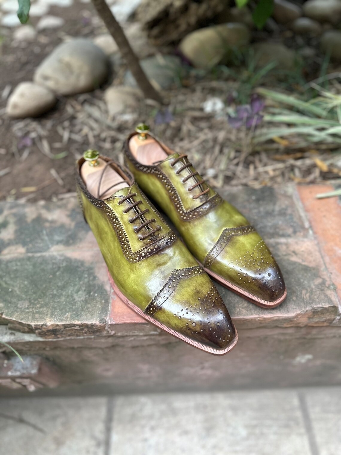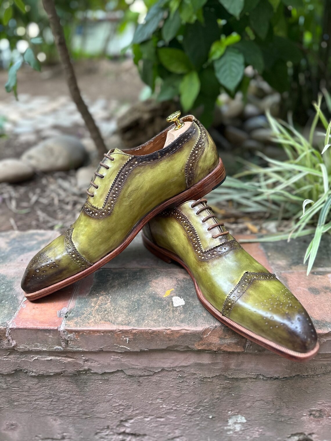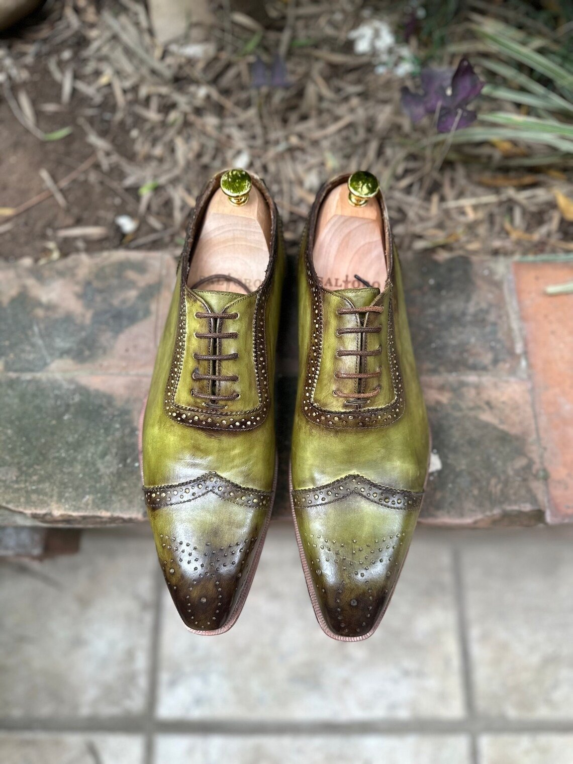 Handmade leather oxfords green patina men dress lace up formal wear original leather wingtip and brogue toe cap shoes