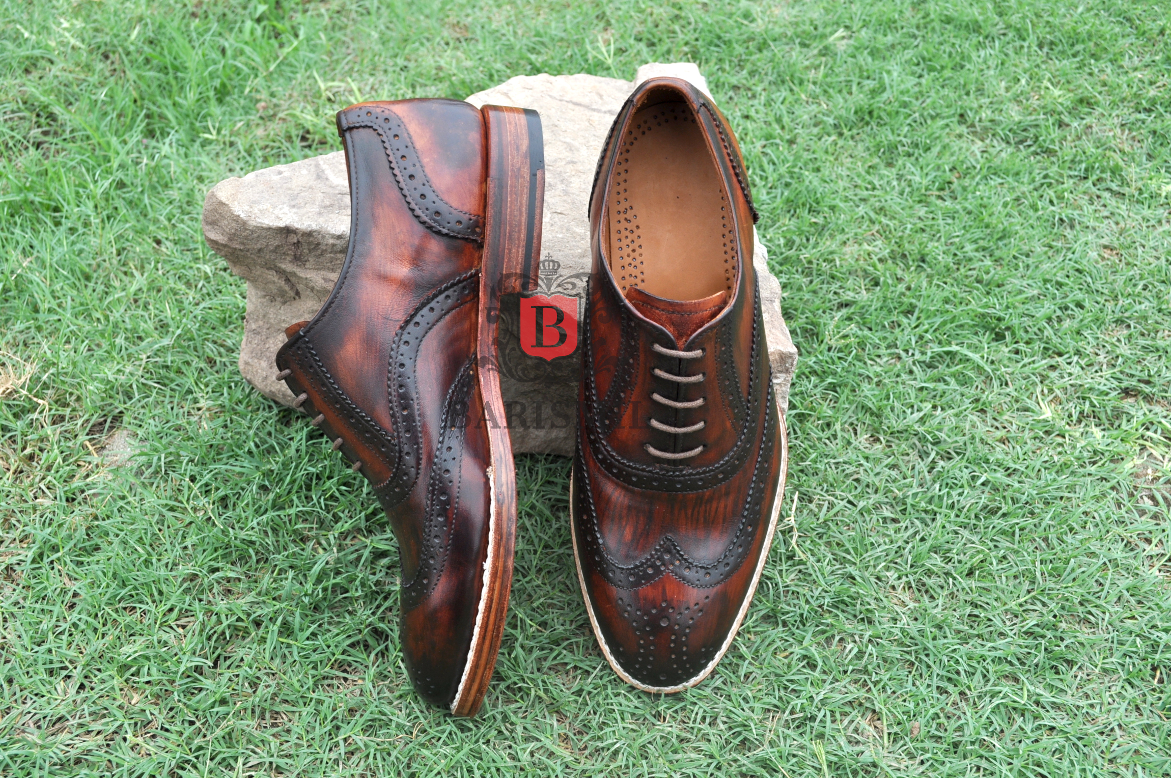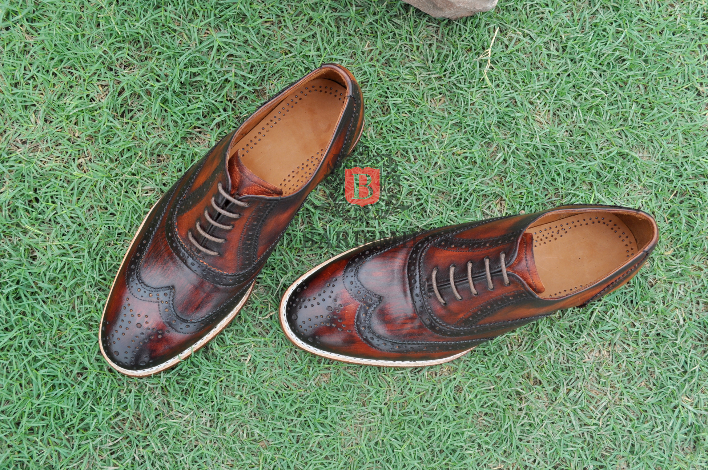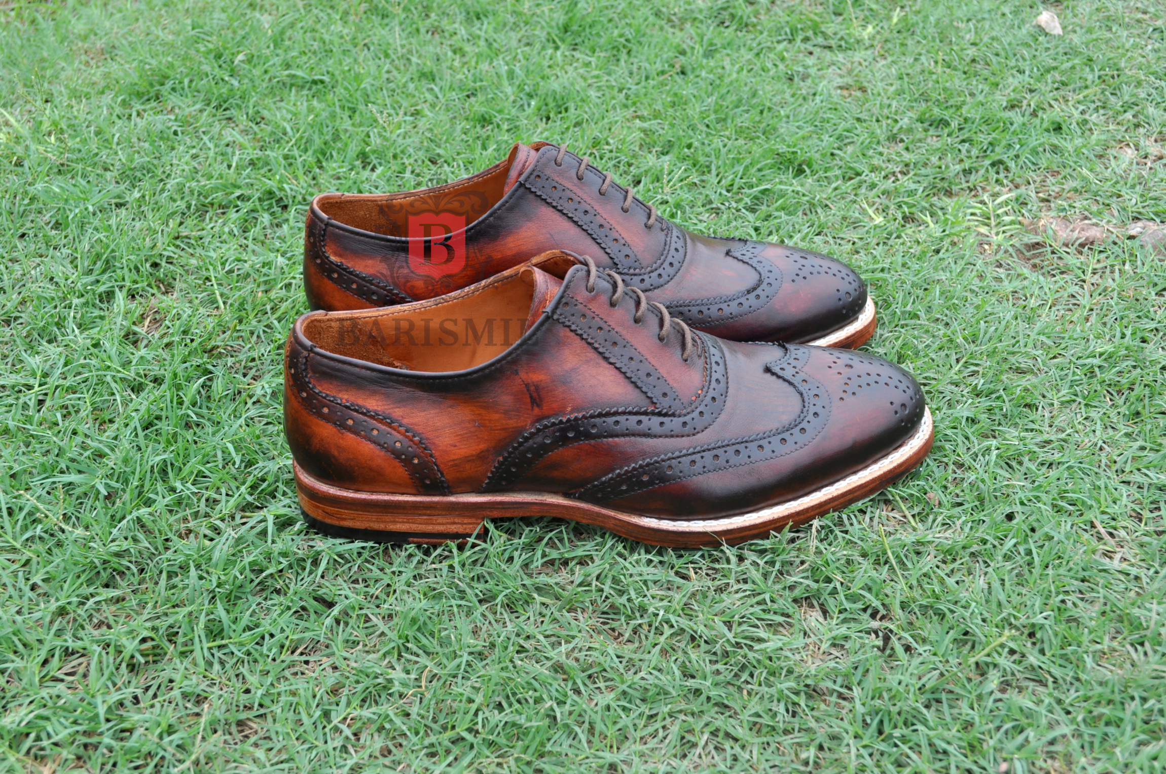 Handmade oxfords premium leather chestnut patina lace up wingtip and brogue shoes for men custom made on orders, wedding shoes, handmade shoes, leather shoes.