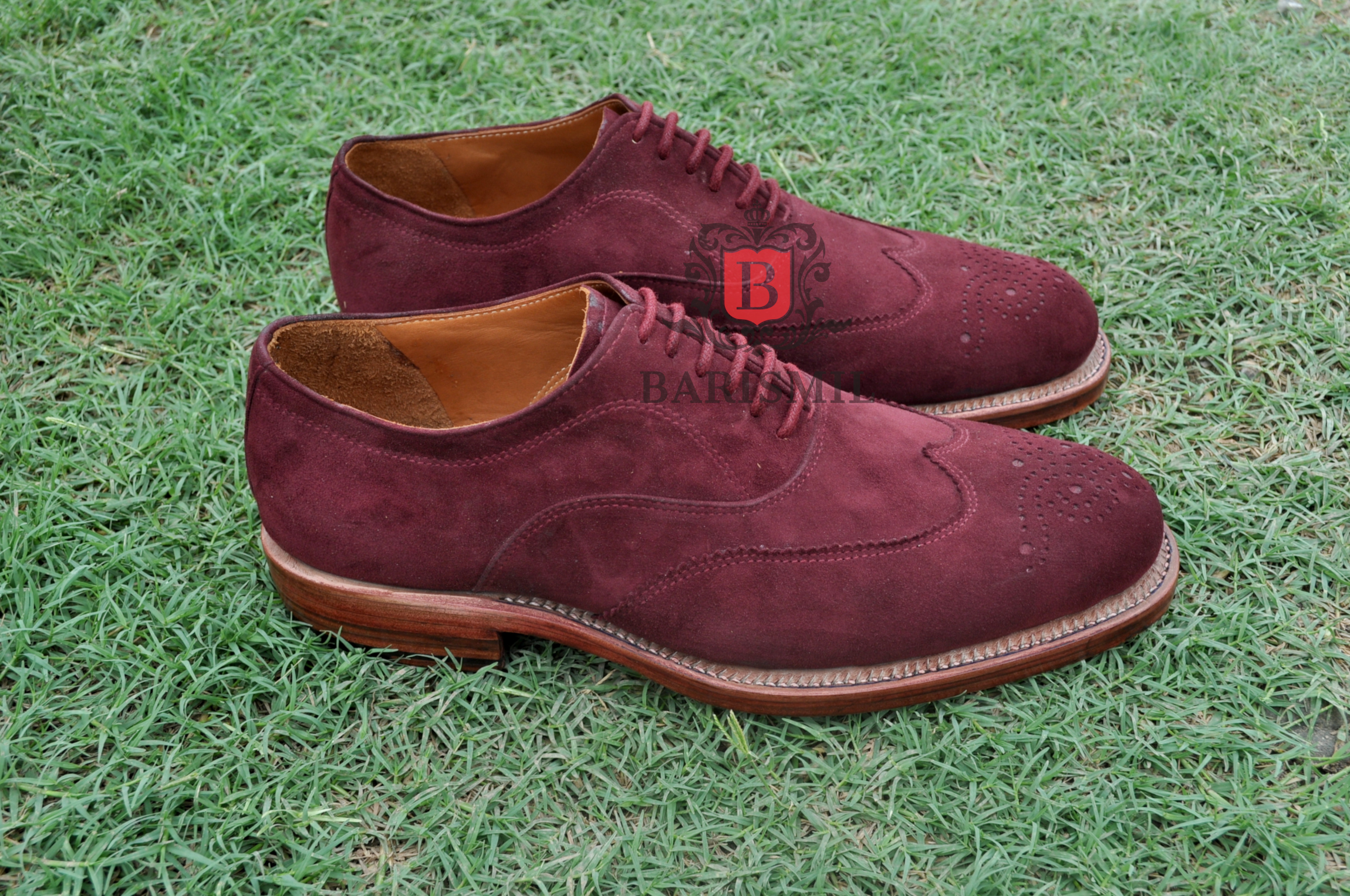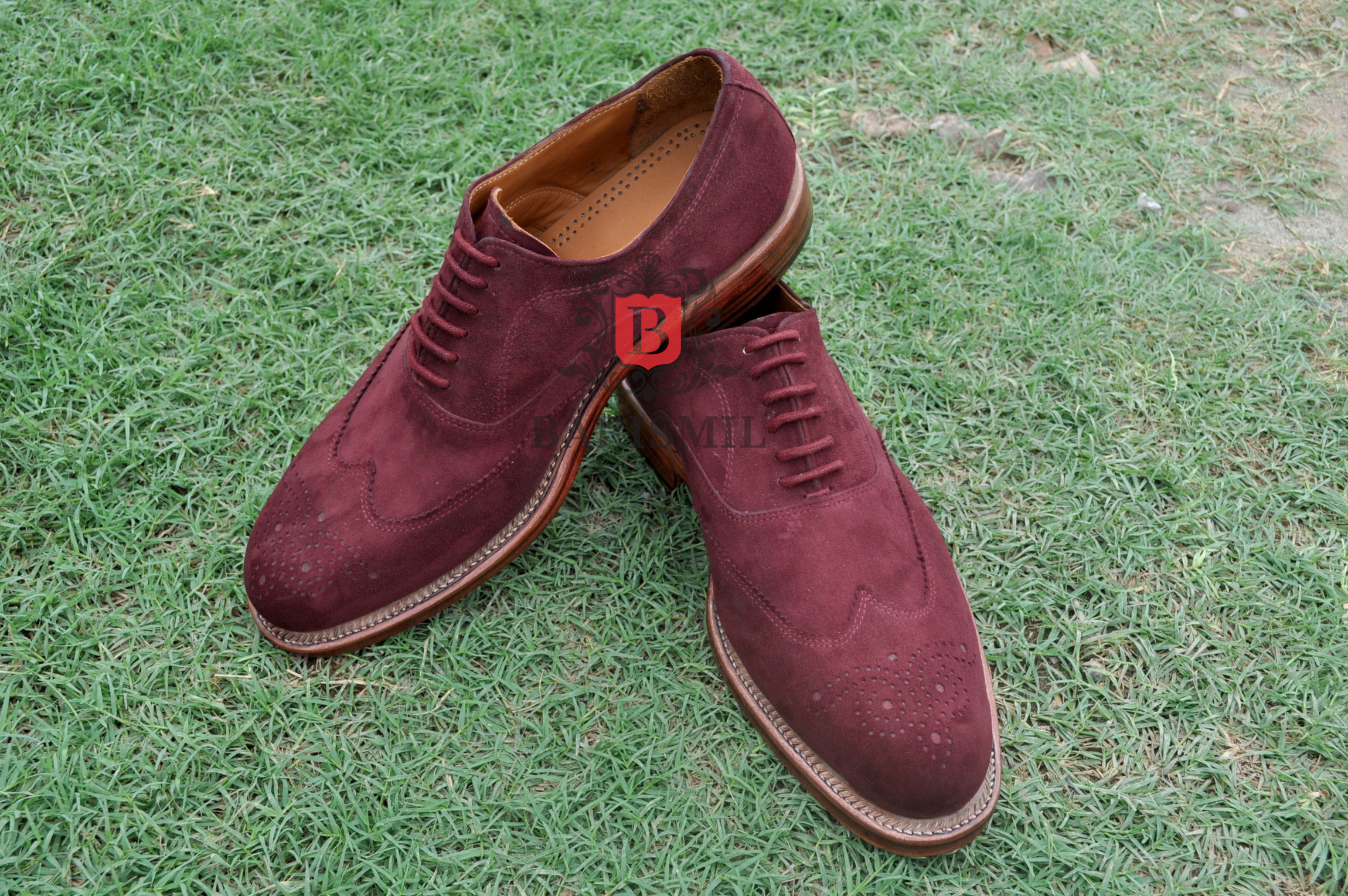 Handmade oxfords red suede premium leather lace up wingtip and brogue shoes for men custom made on orders.