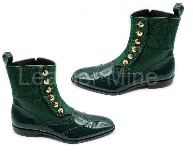 Men's Handmade Green Leather Button Boots, Genuine Leather dress Boots For Men