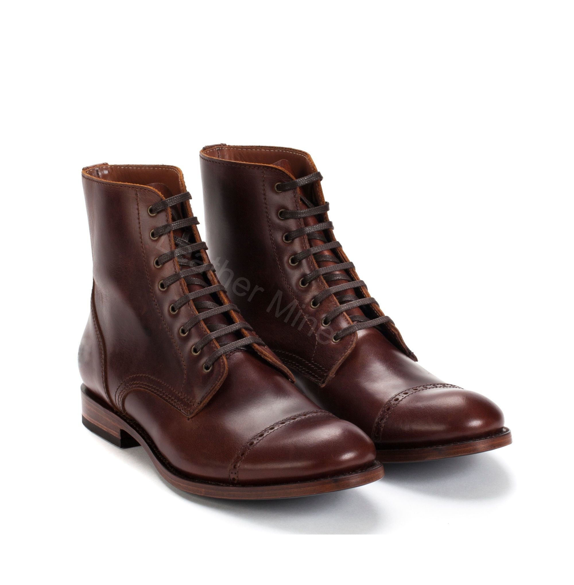 Mens Handmade Brown Leather Derby Lace Up Ankle Boots
