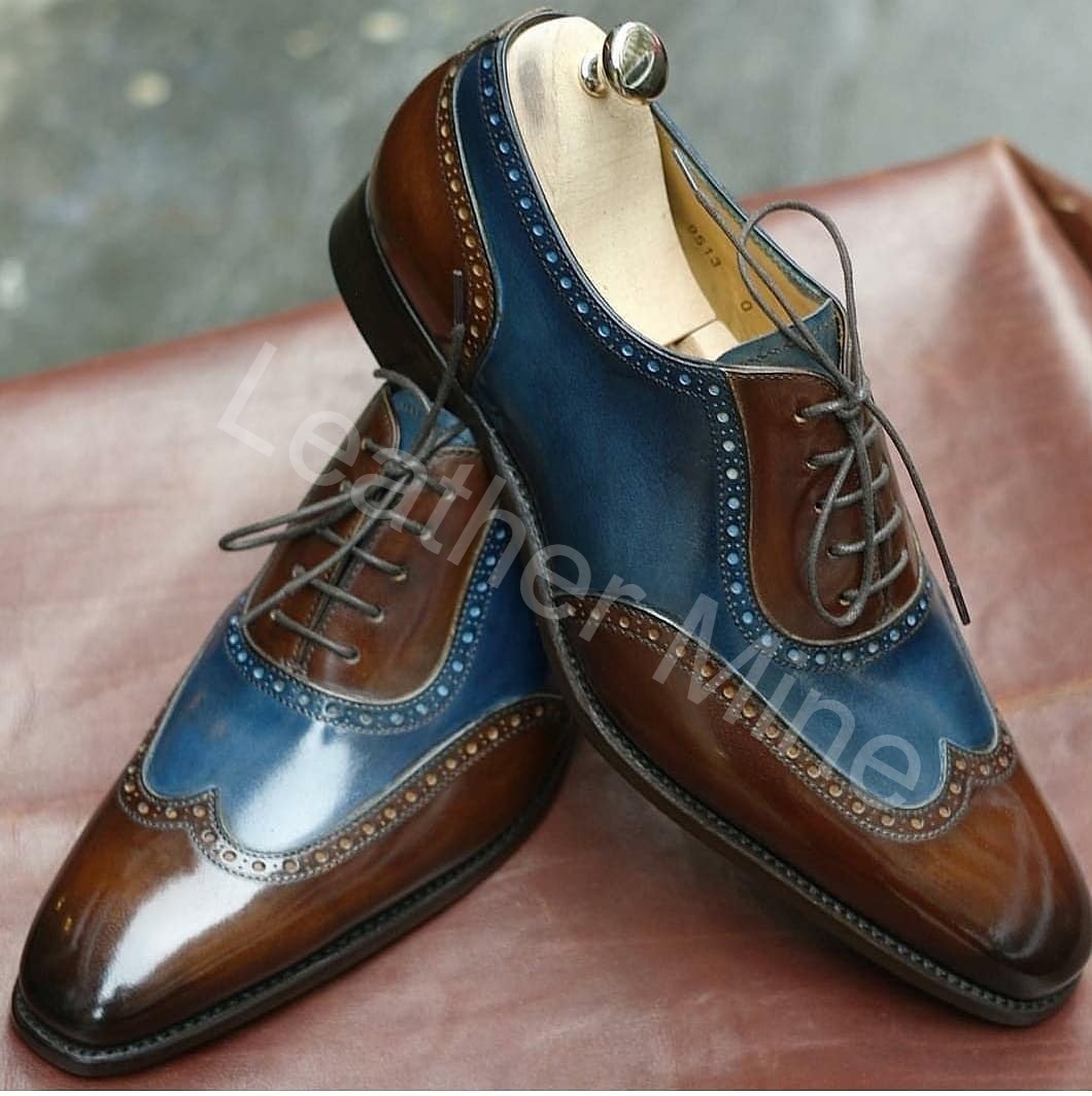 Men's Handmade Two Tone Brogue Wingtip Shoes, Genuine Leather Dress Shoes
