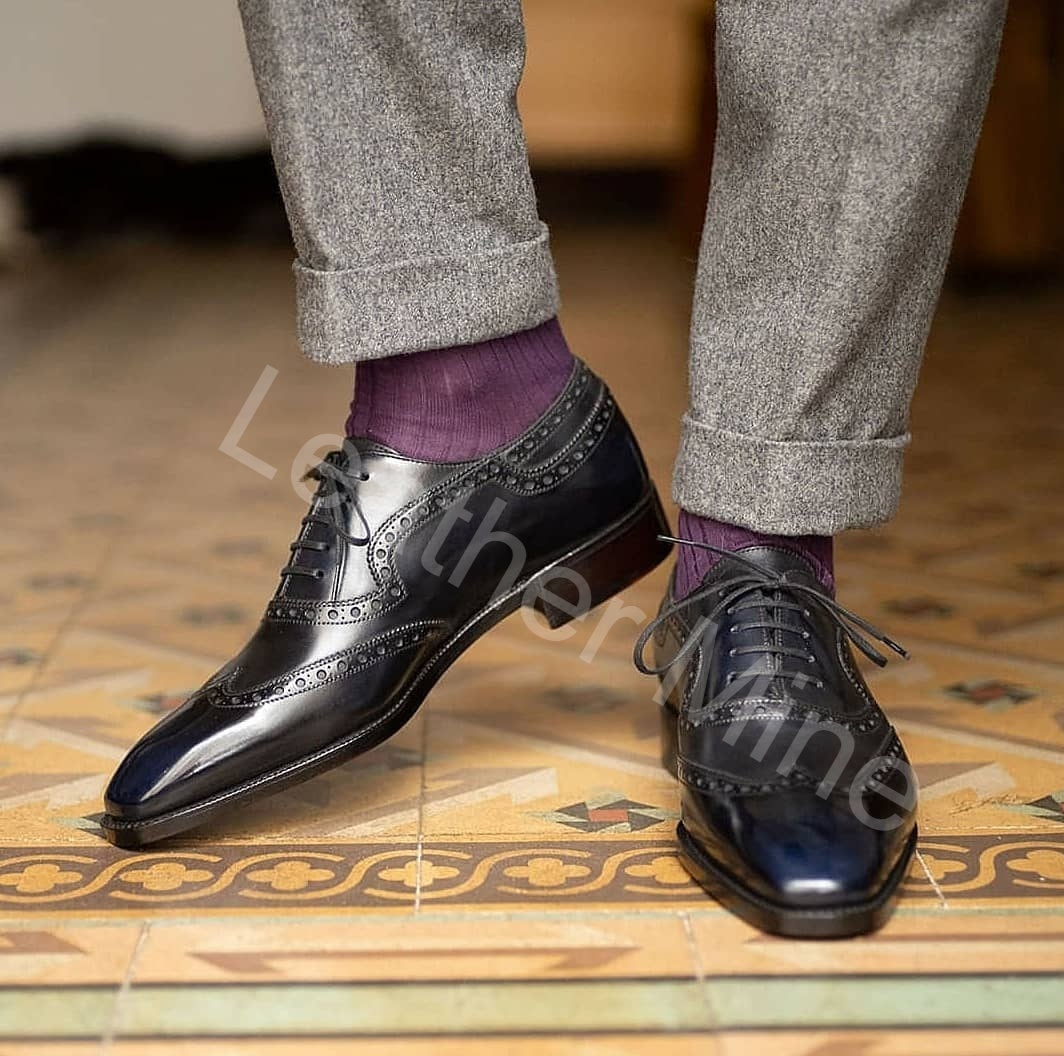 Men's Leather Brogue Wingtip Shoes, Handmade Black Leather Formal Shoes