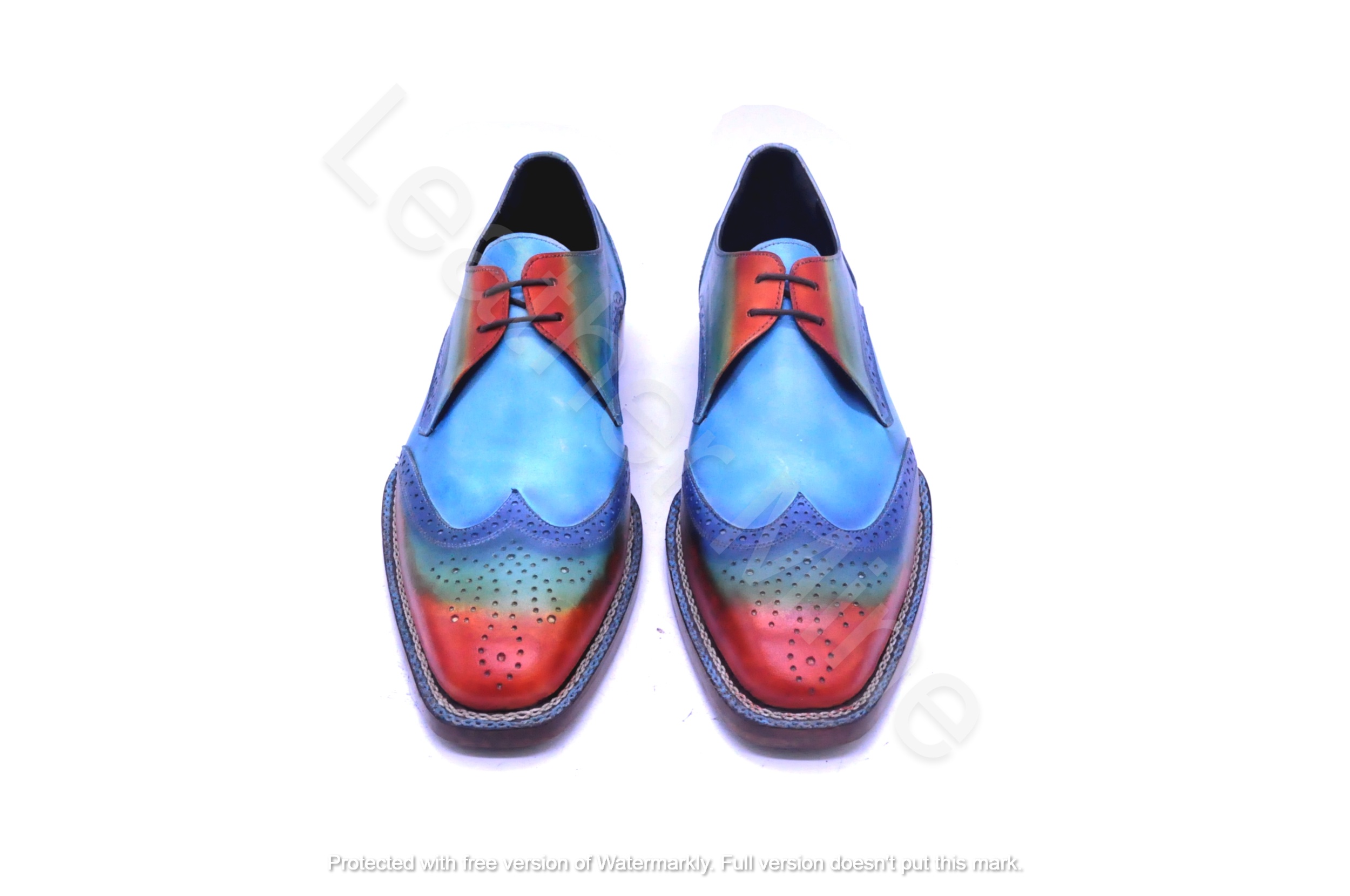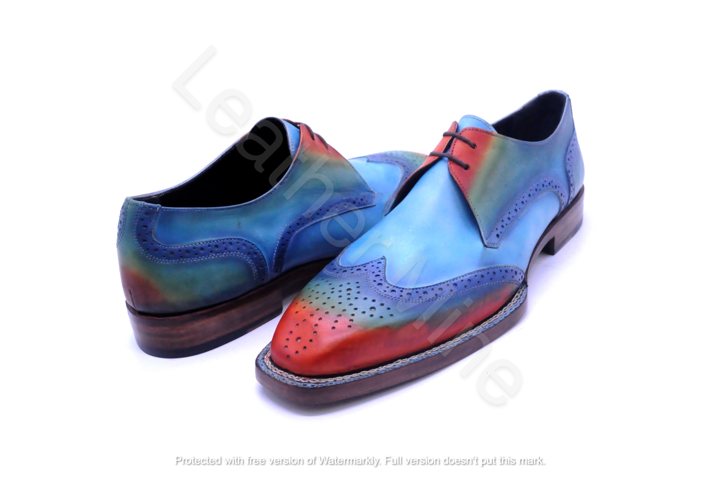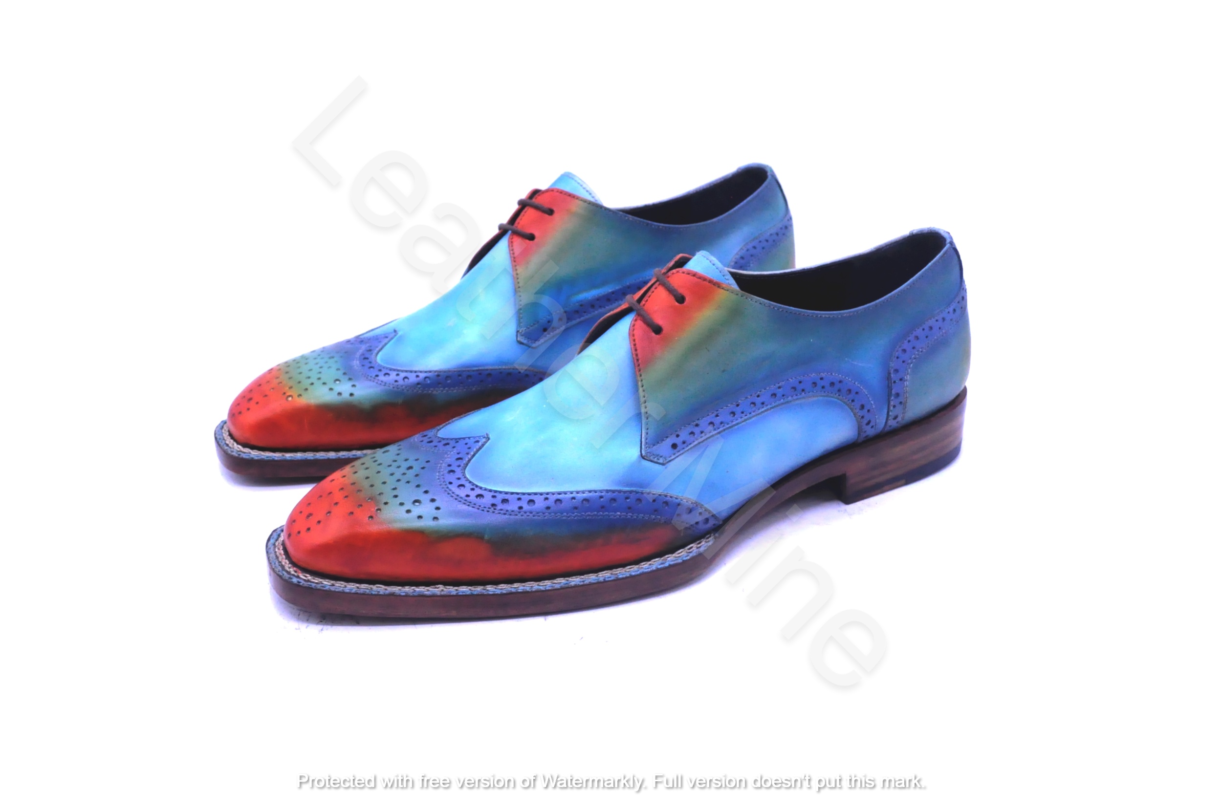 Men's Handmade Blue Patina Wingtip Derby Leather Dress Shoes For Men