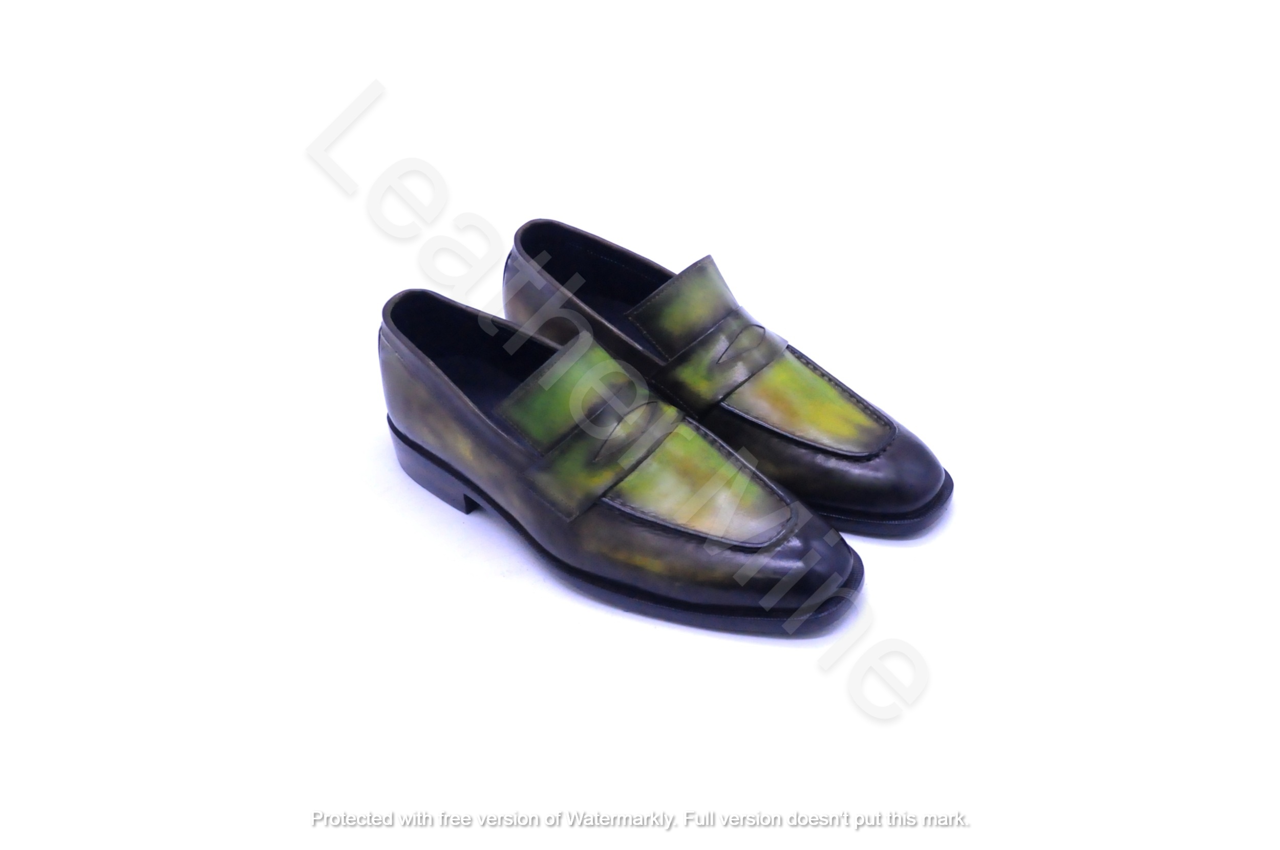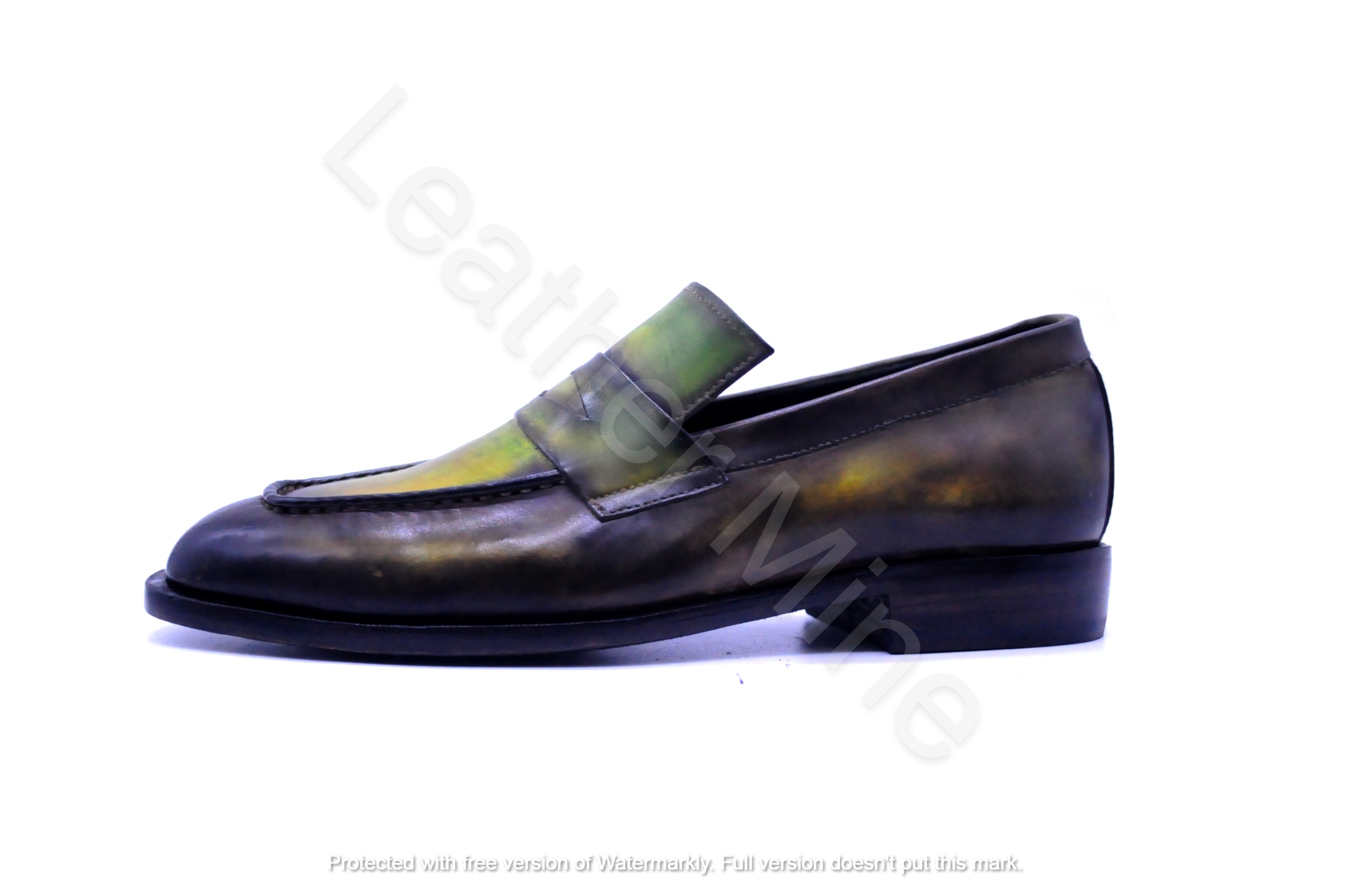 Handmade Men's Green Patina Dress Loafers, Hand Colored Unique Shoes For Men