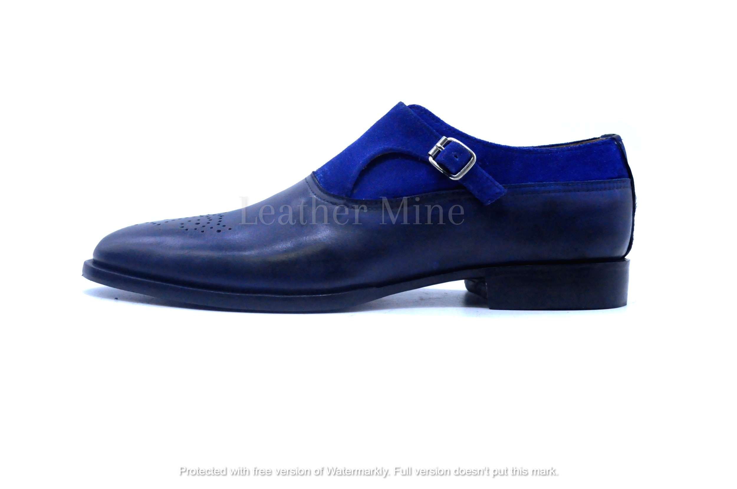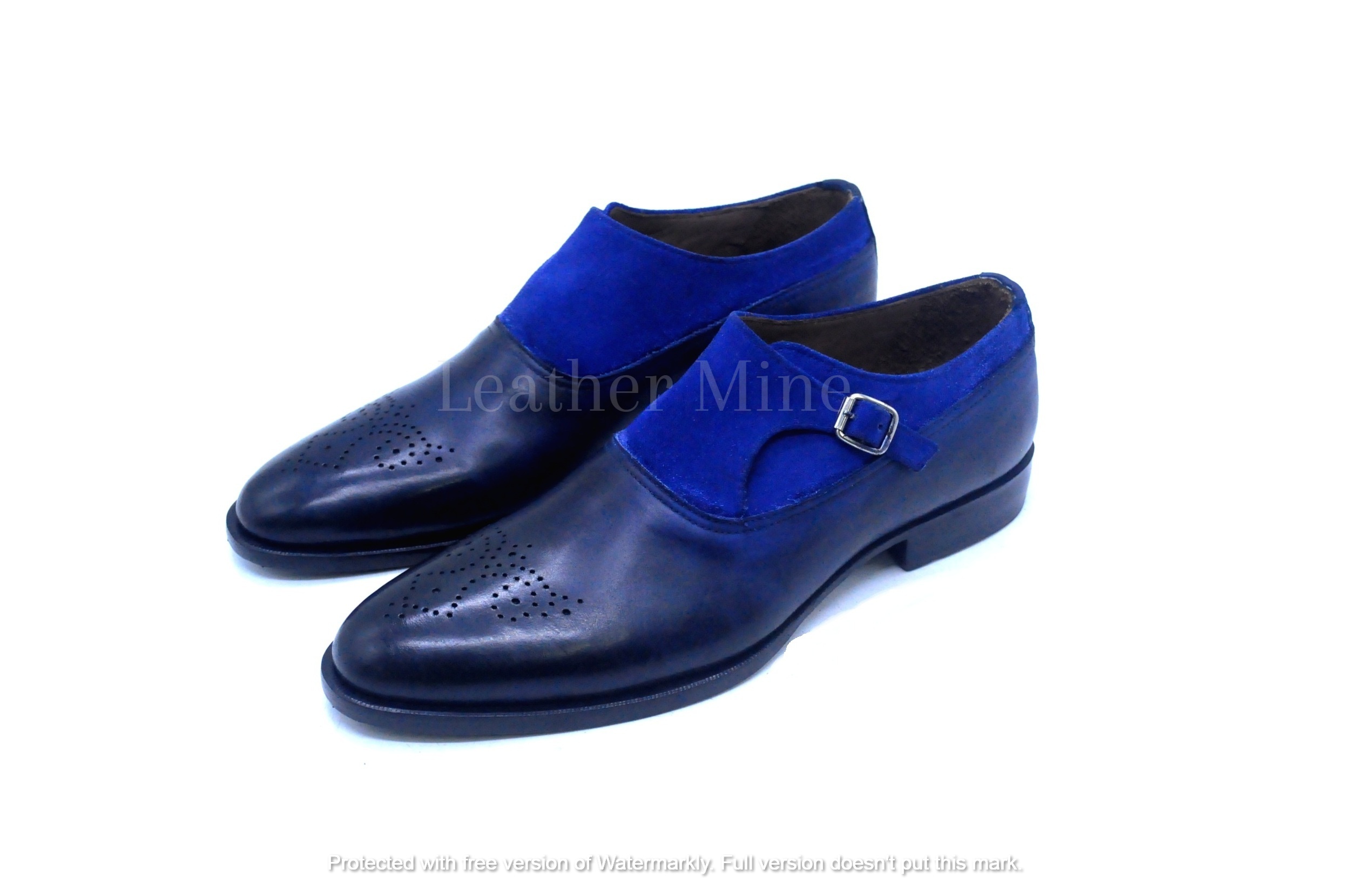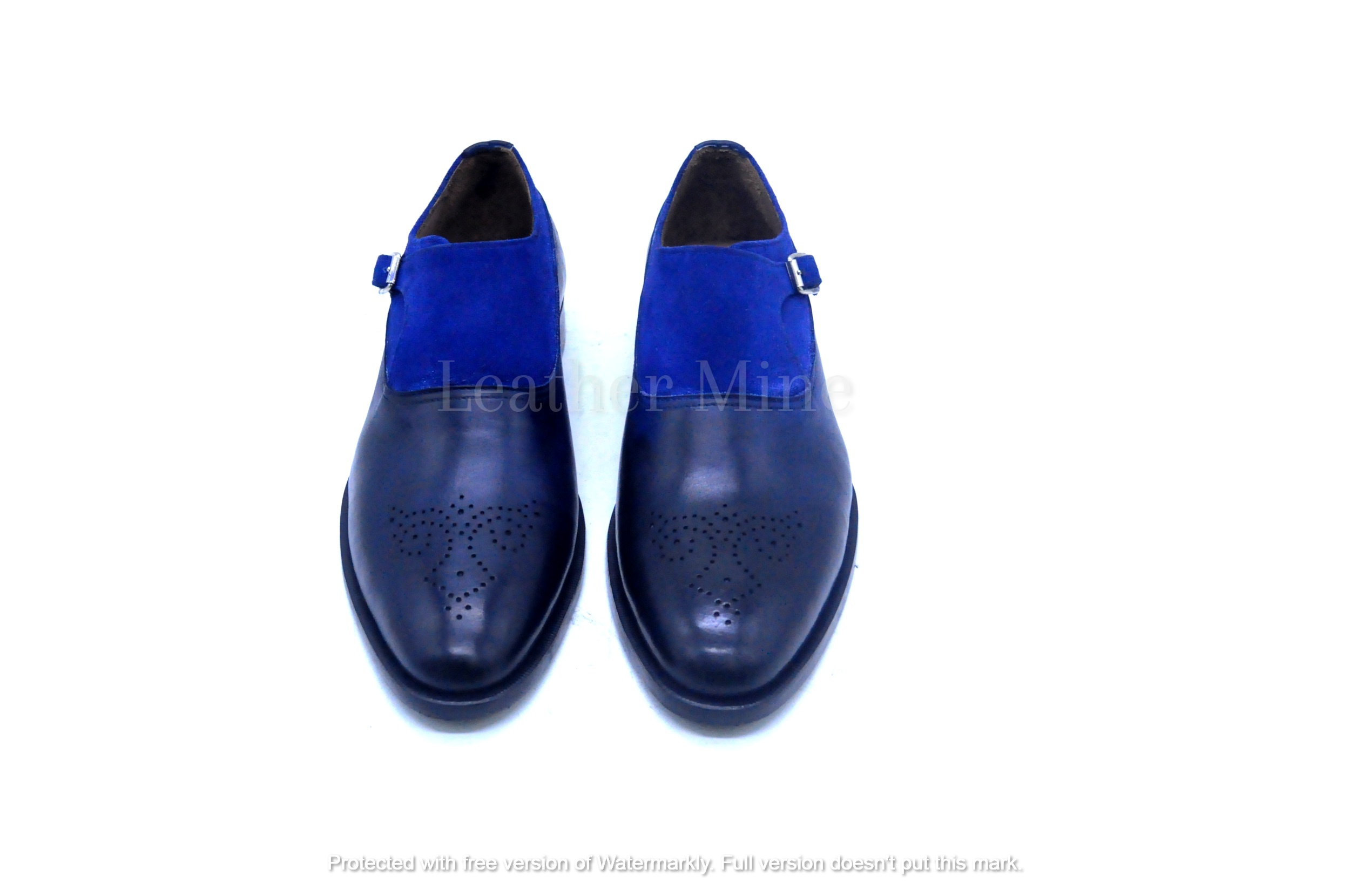 Handmade Men's Black and Blue Suede Leather Monk Strap Dress Shoes For Men