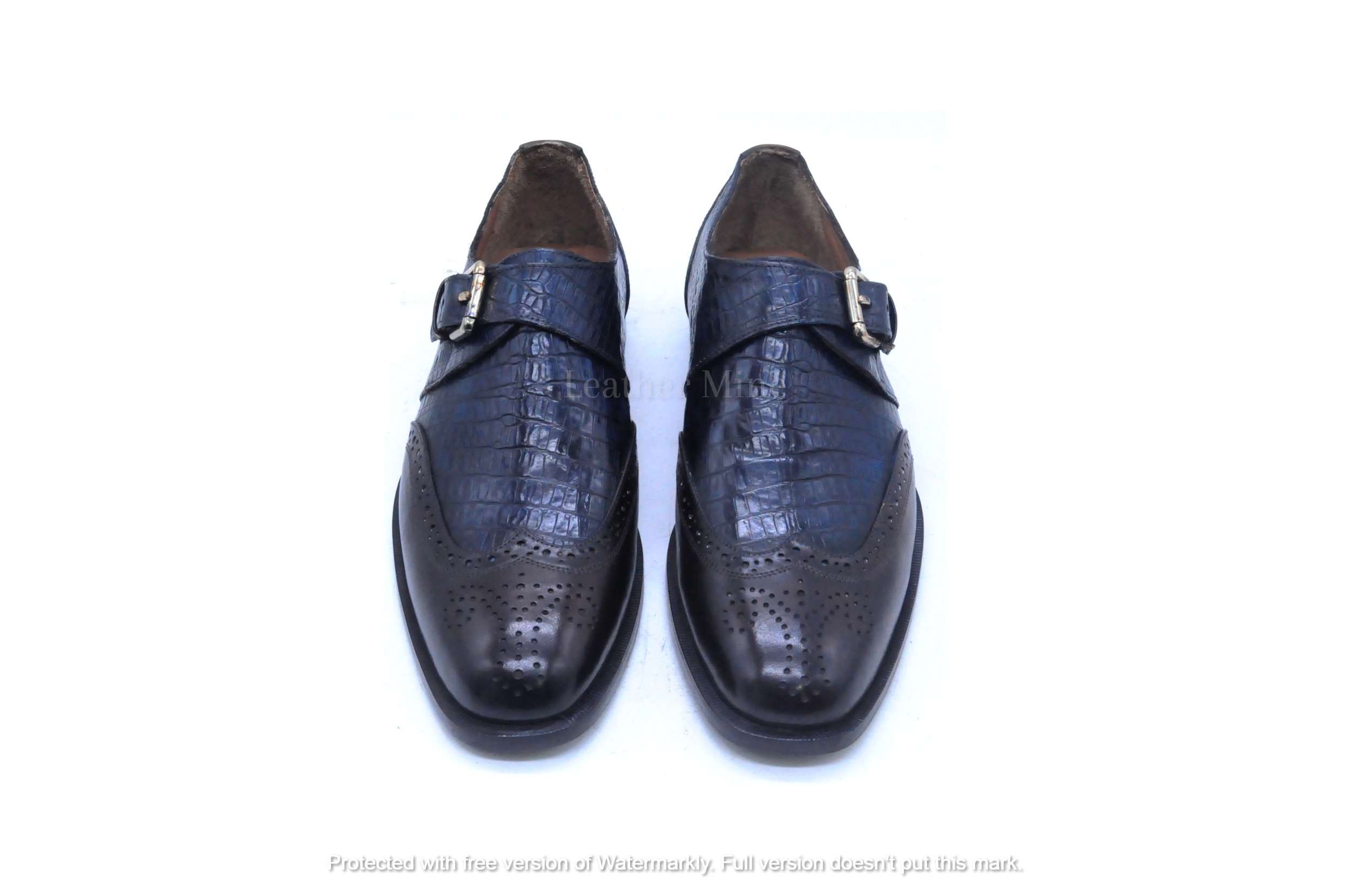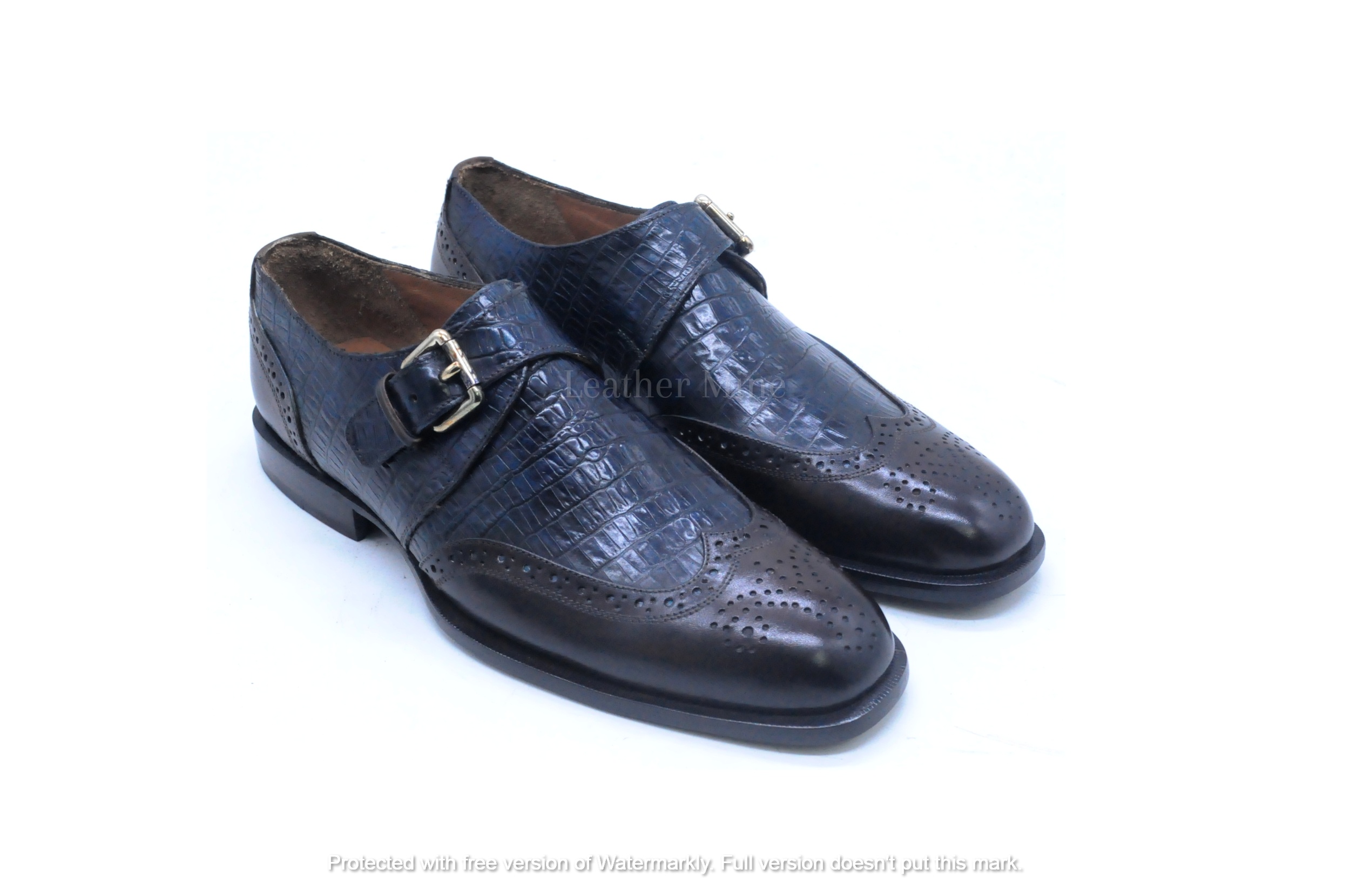 Men's Handmade Blue Leather Wingtip Monk Strap Dress Shoes For Men