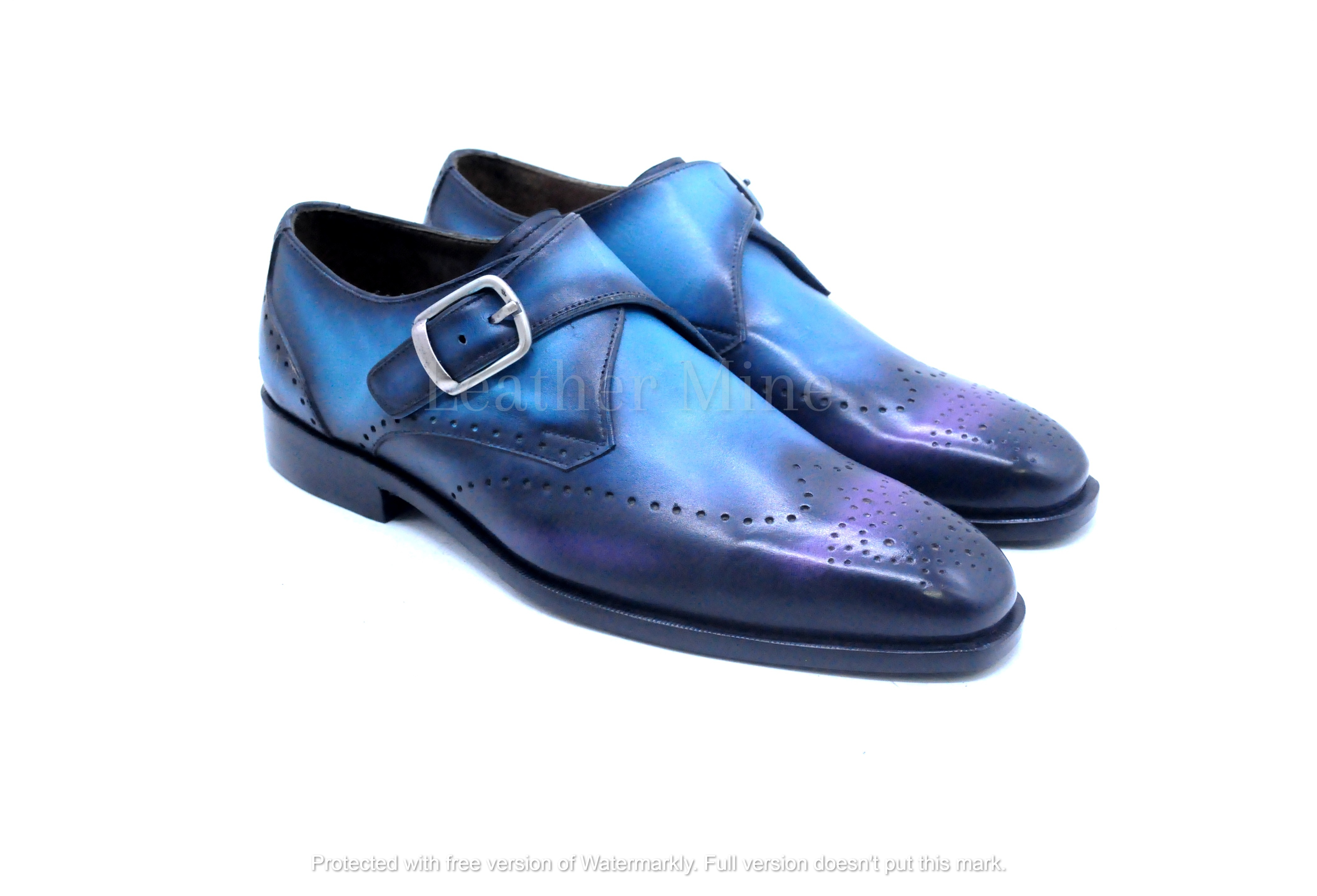 Handmade Blue Patina Monk strap Leather Shoes, Men's Dress Shoes