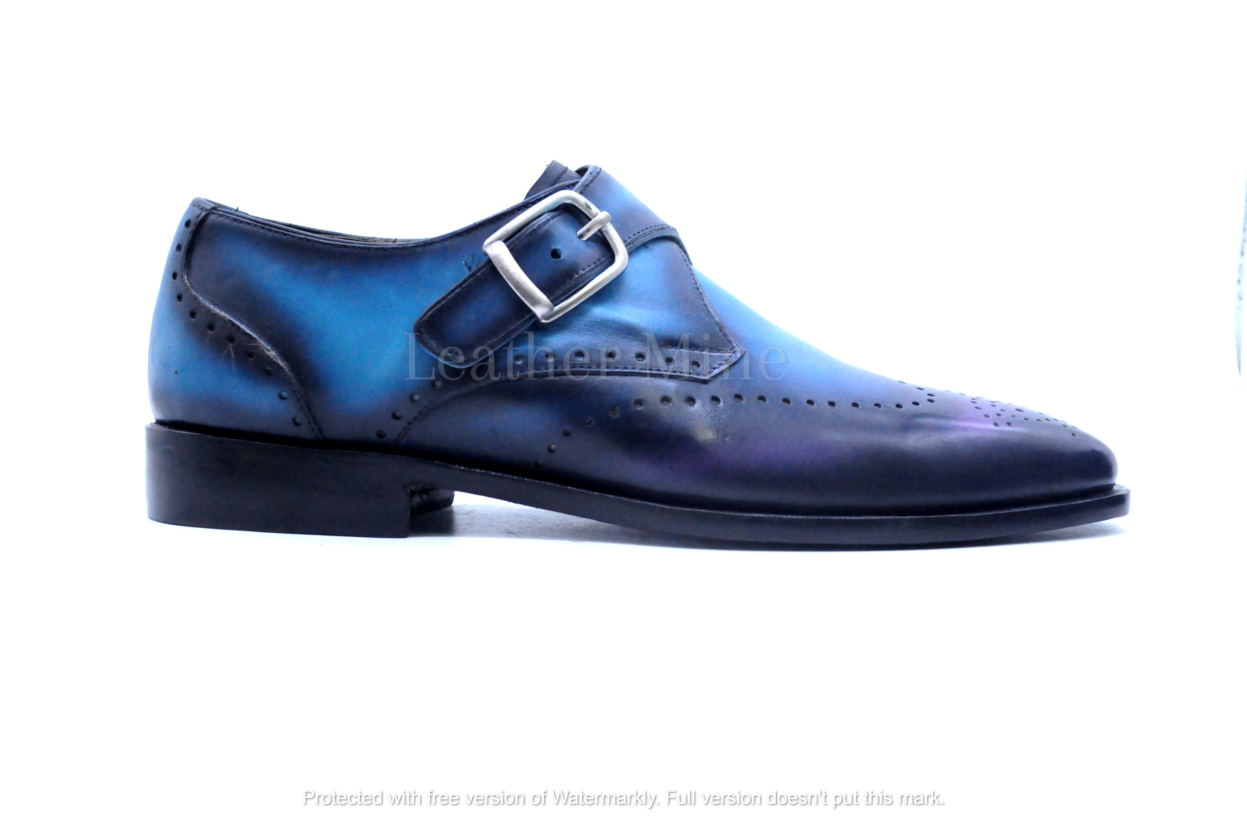Men's Monk Strap Shoes, Handmade Blue Patina Leather Monk Shoes For Men