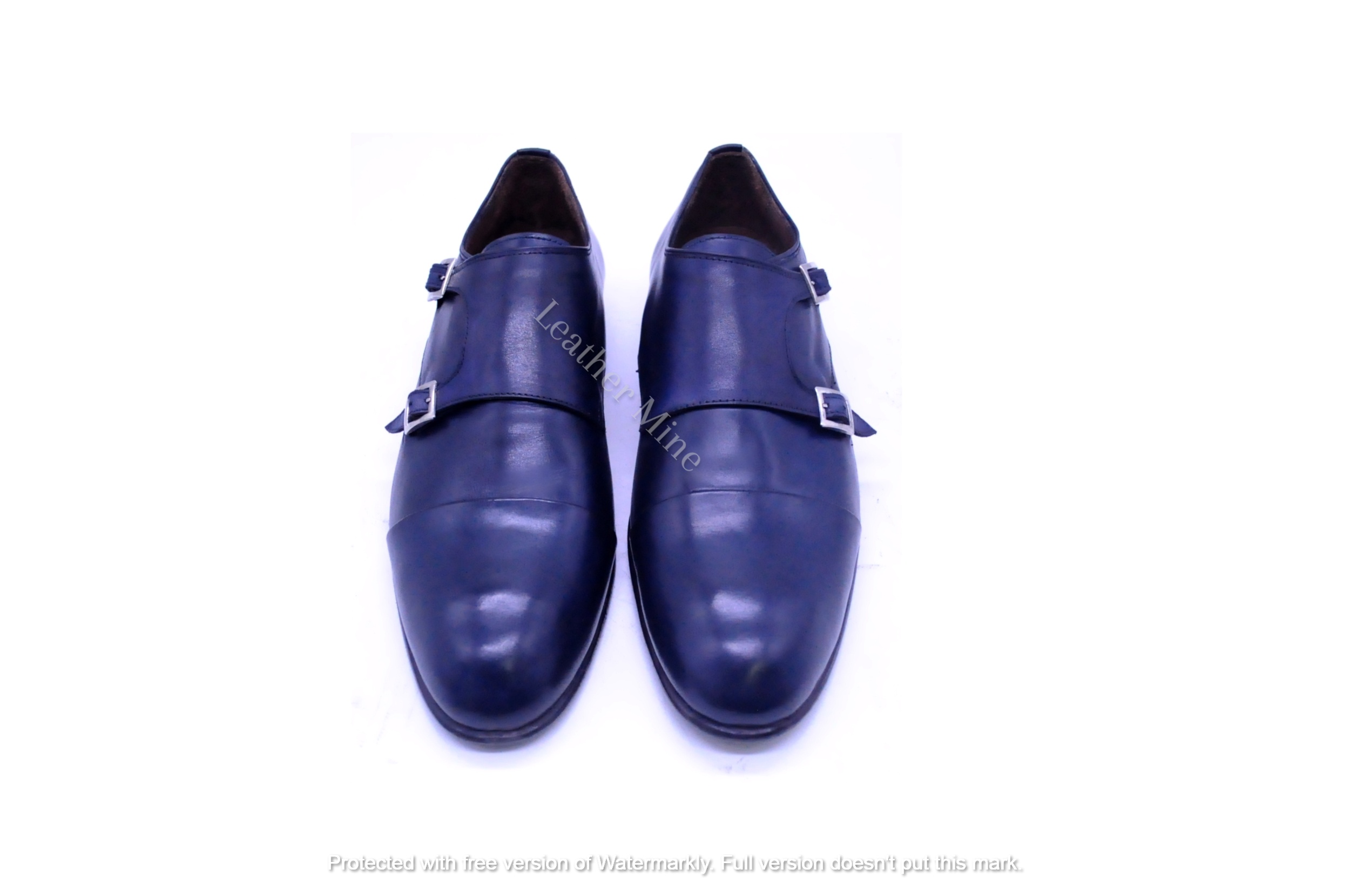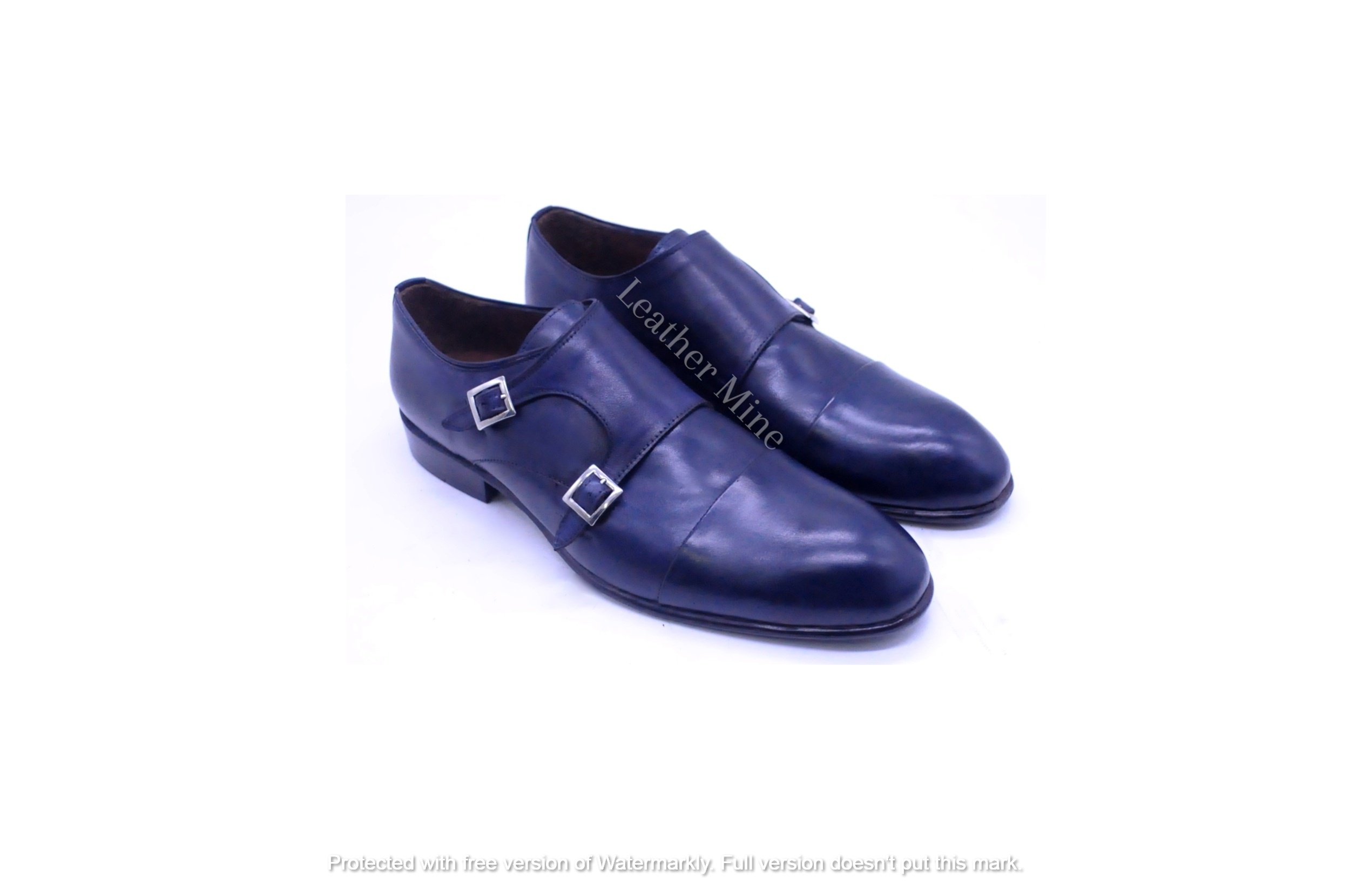 Men's Handmade Blue Leather Double Monk Strap Formal Shoes