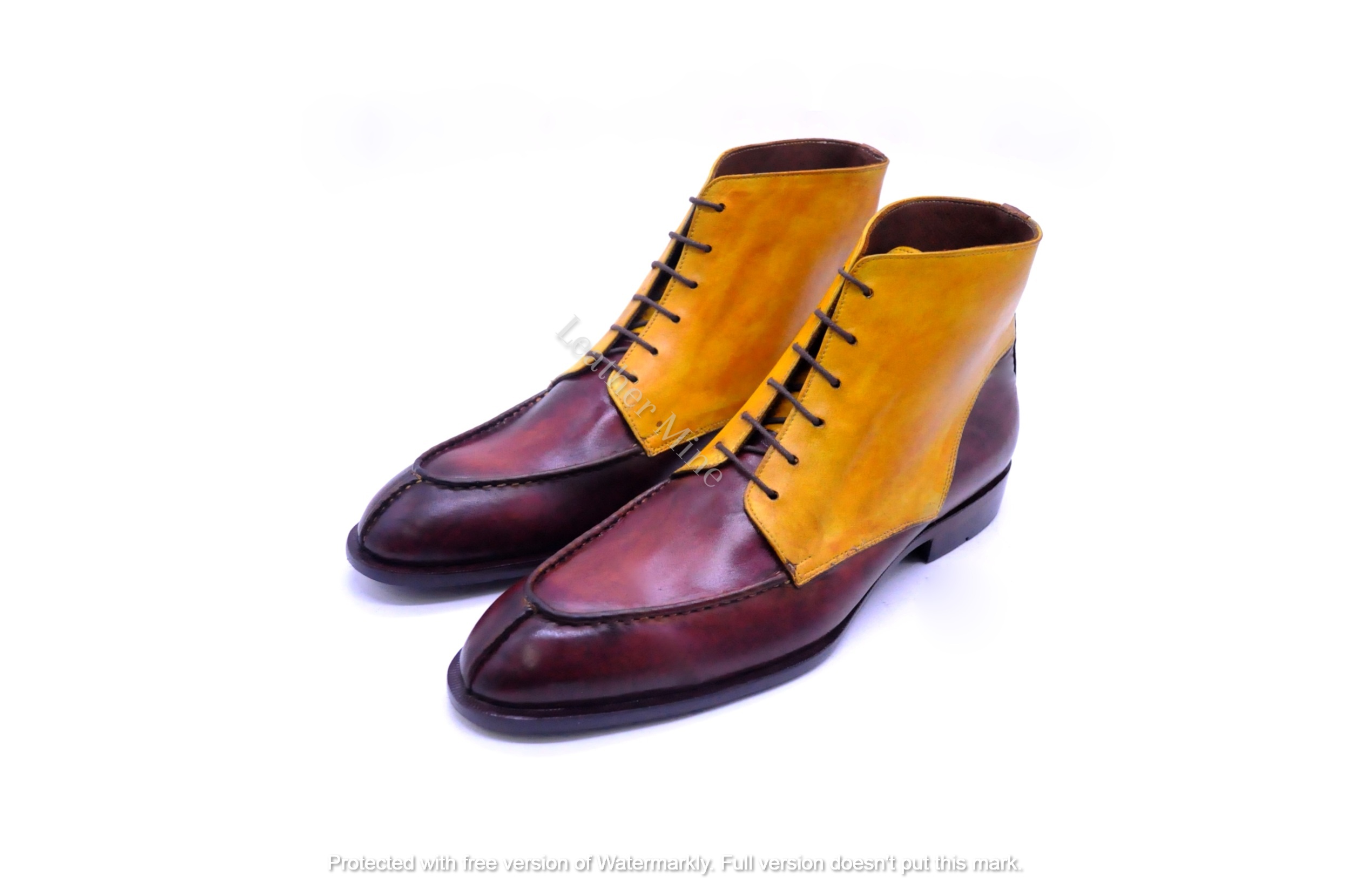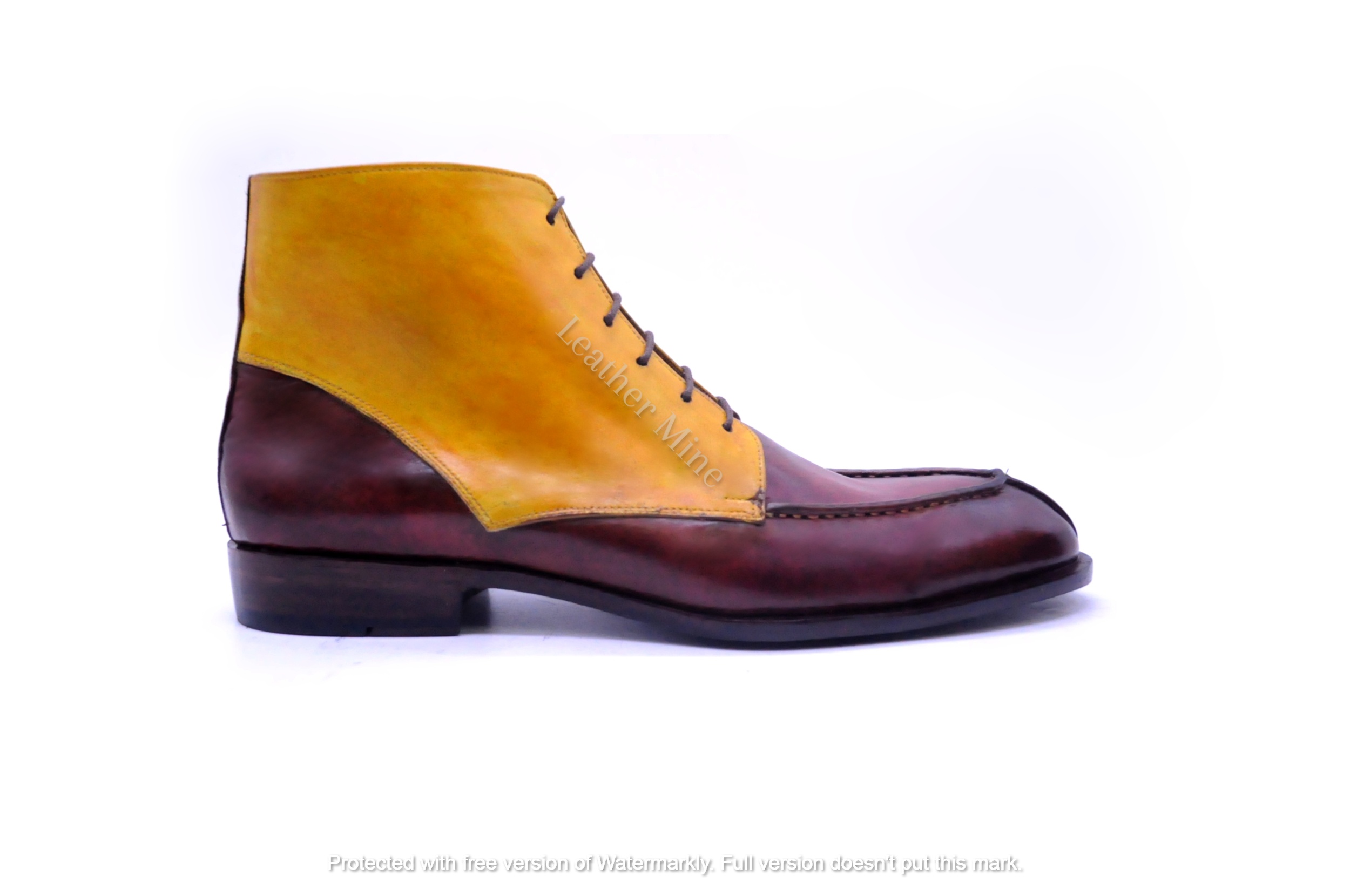 Handmade Men's Yellow Patina Formal Leather Ankle High Boots For Men