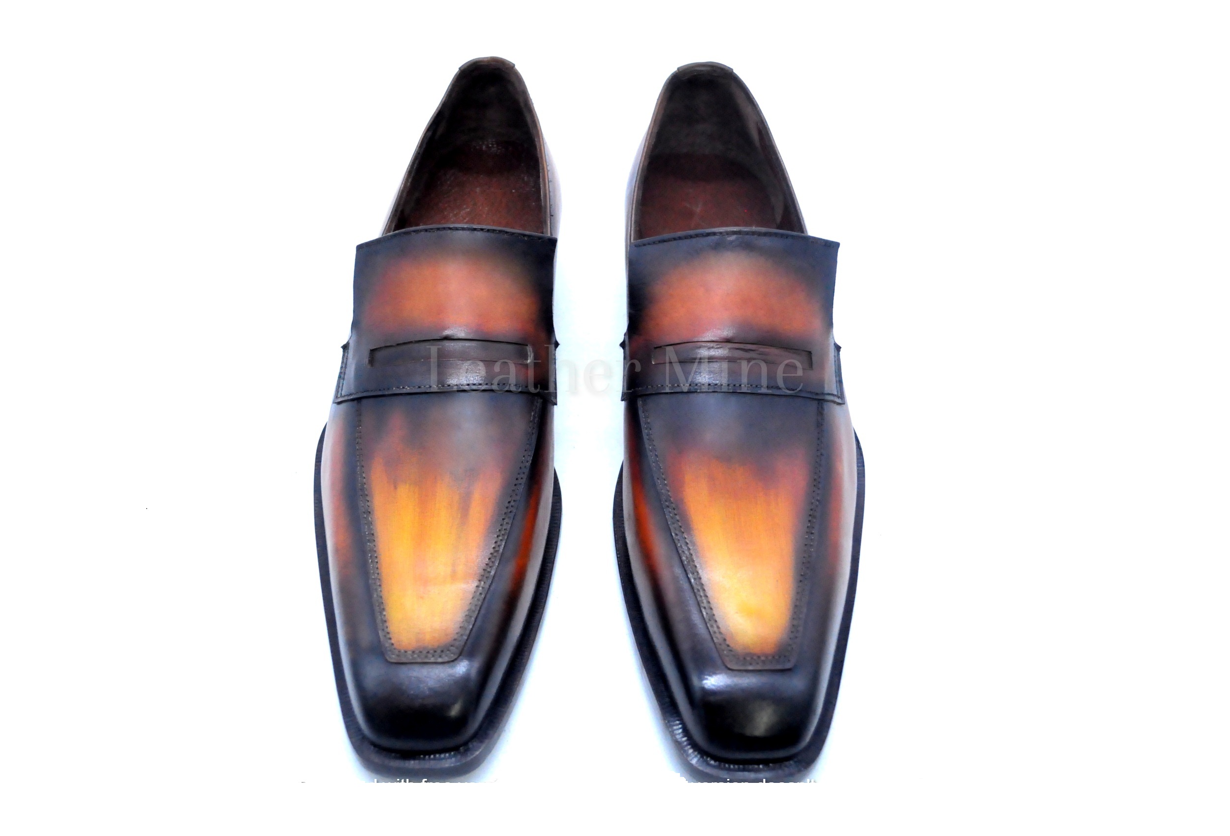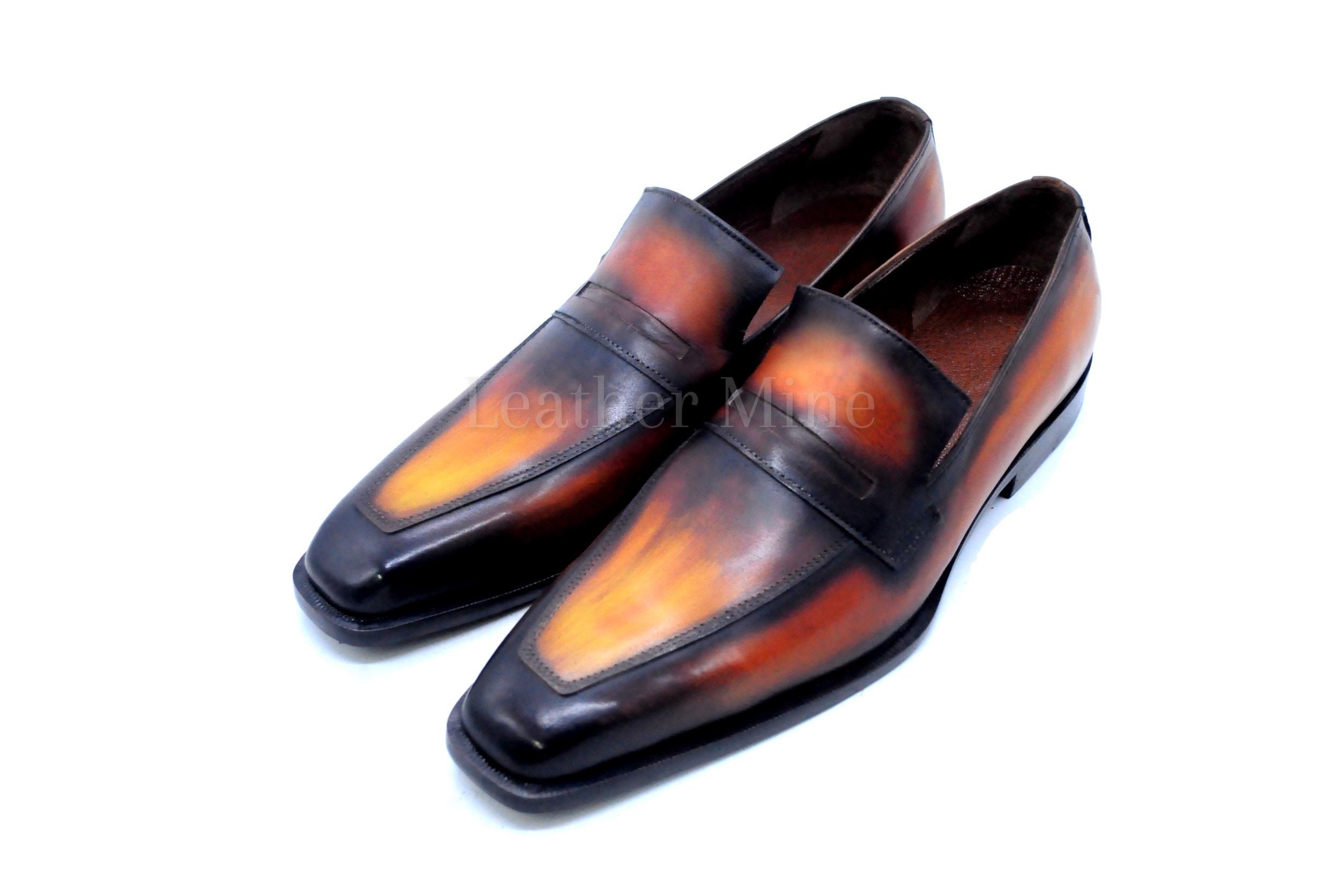 Handmade Tan Patina Loafers Custom Made Shoes, Leather Dress Shoes Mens