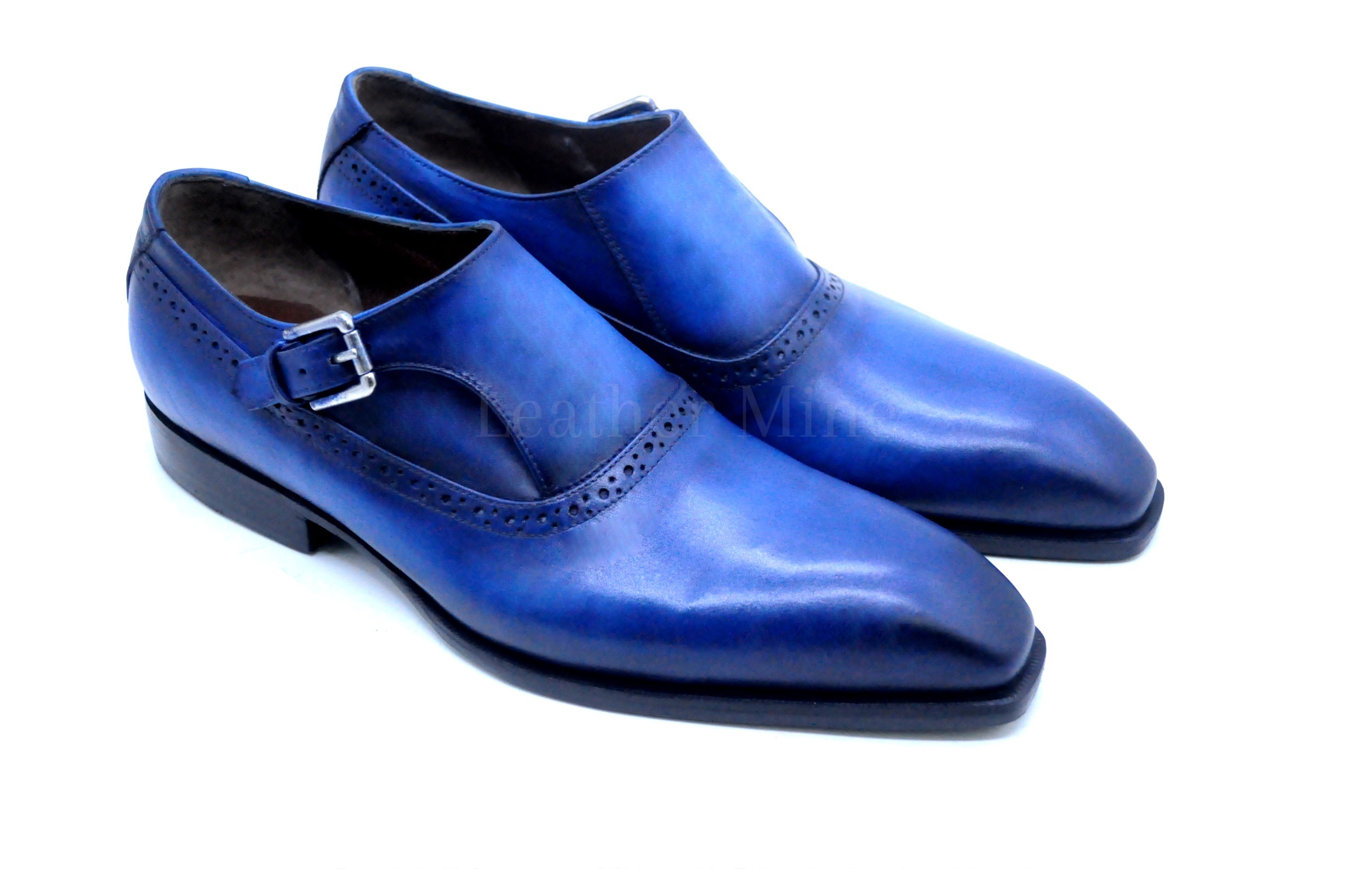 Handmade Men's Blue Patina Leather Monk Strap Custom Made Formal Shoes