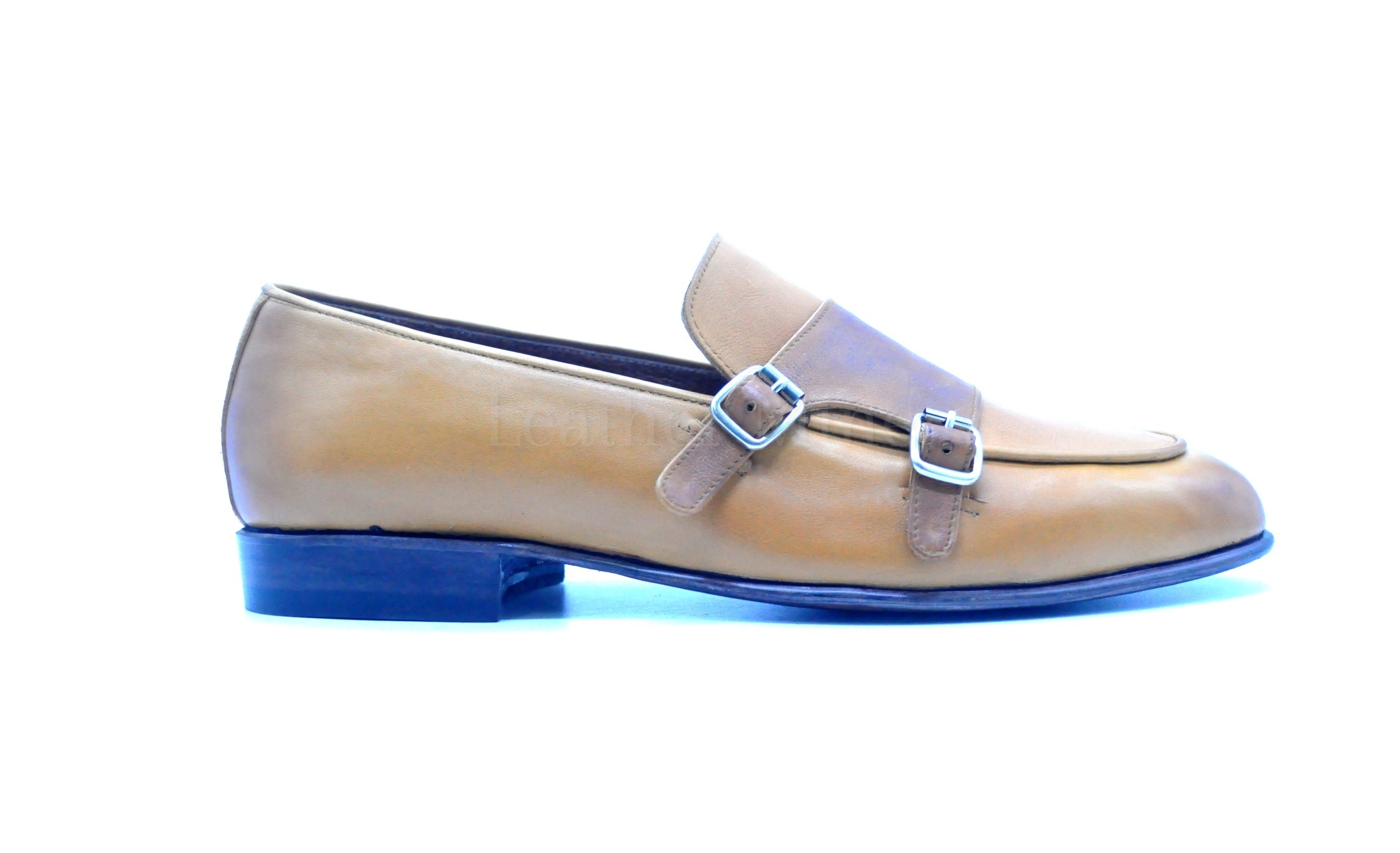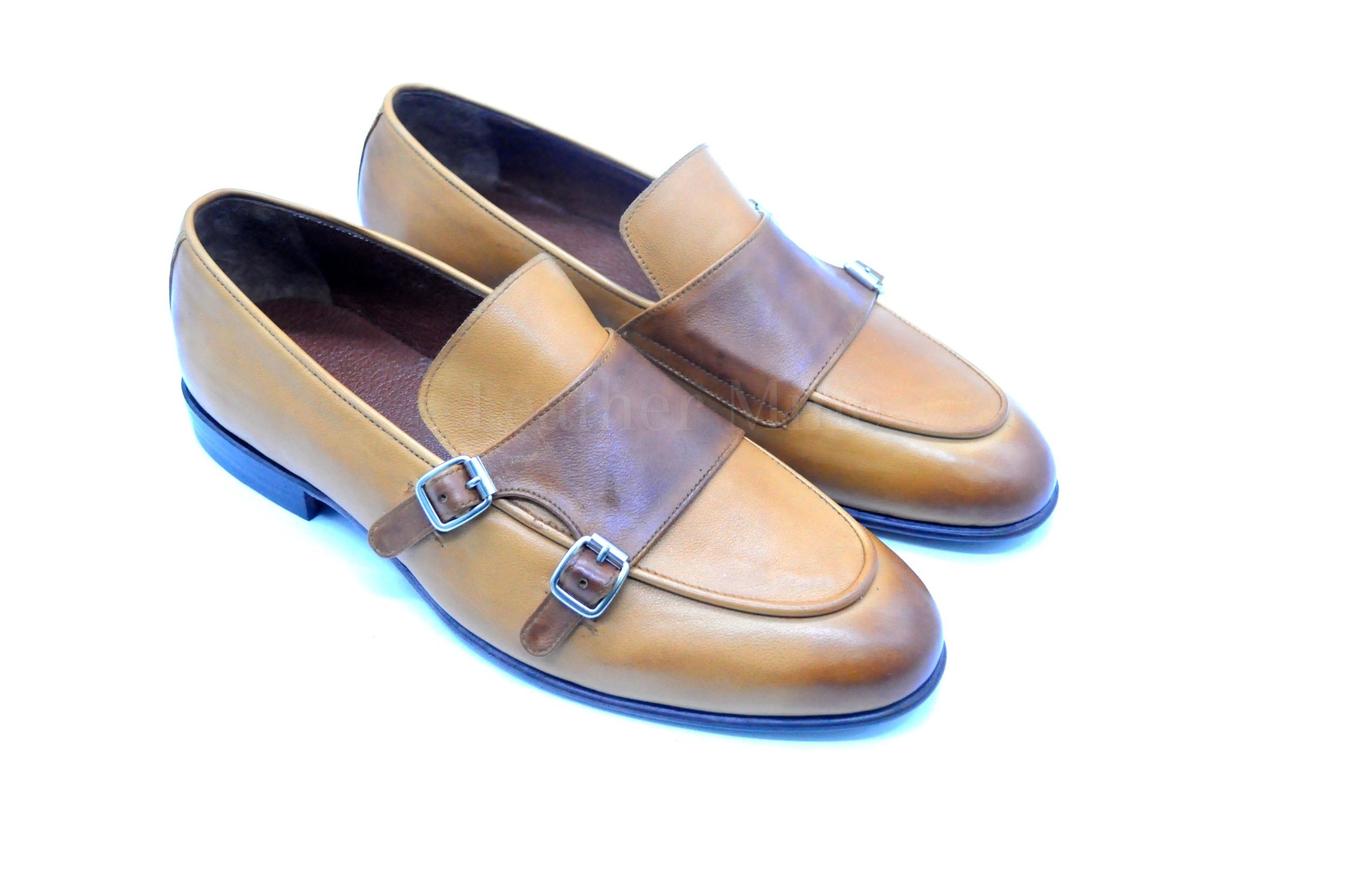 Handmade Tan Double Monk Dress Shoes, Genuine Leather Formal Shoes