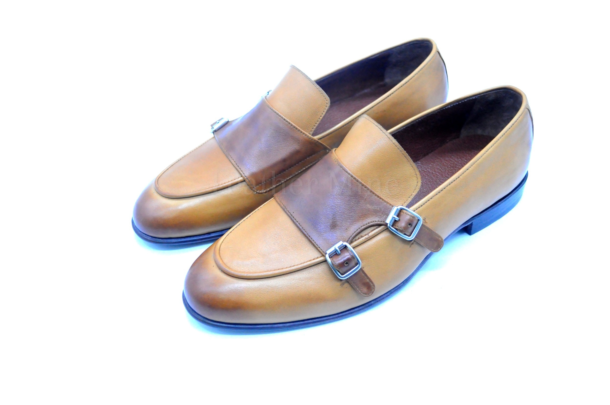 Tan Double Monk Dress Shoes For Men, Genuine Leather Custom Shoes