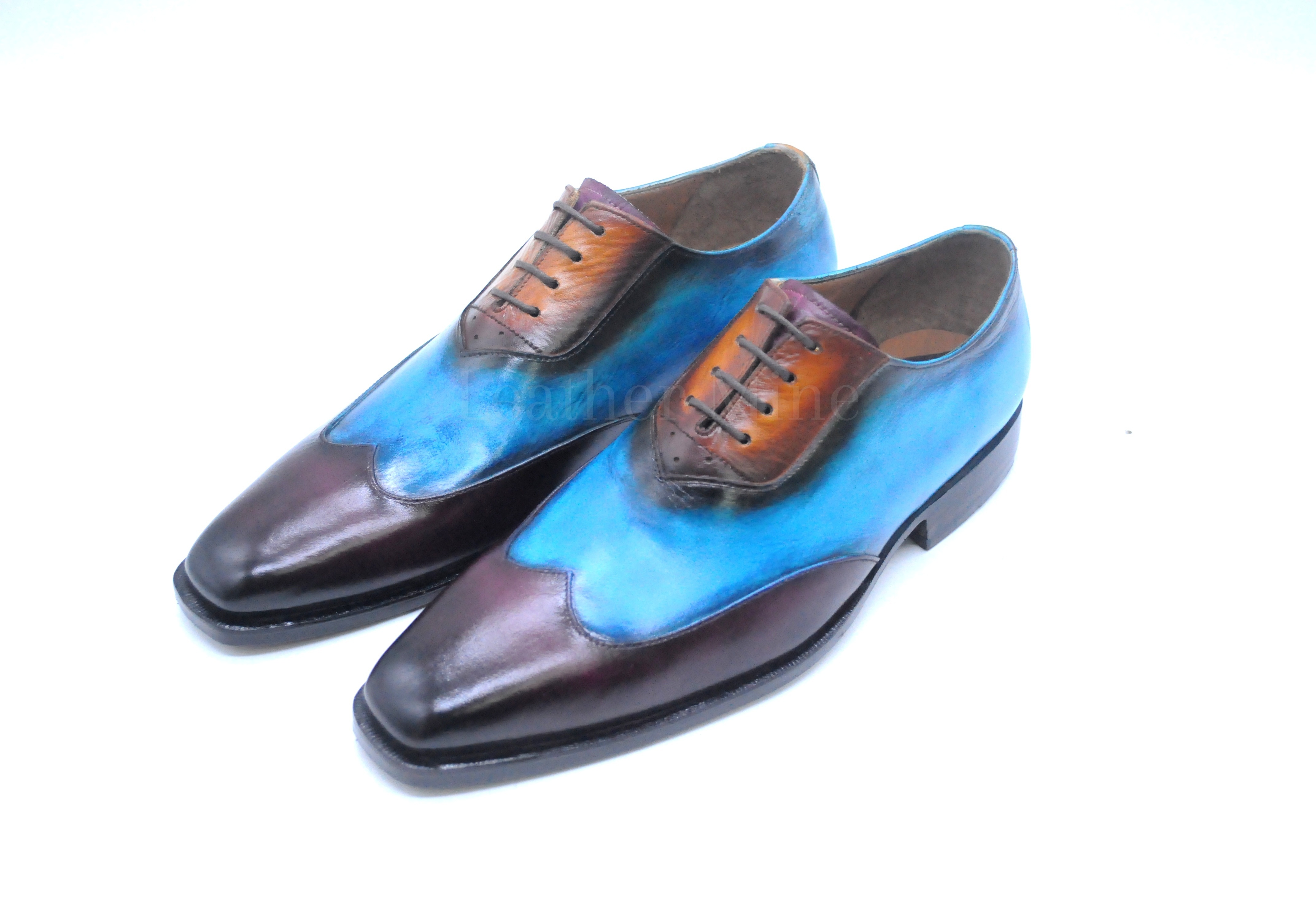 Men's Handmade Blue Patina Leather Wingtip Formal Custom Made Shoes