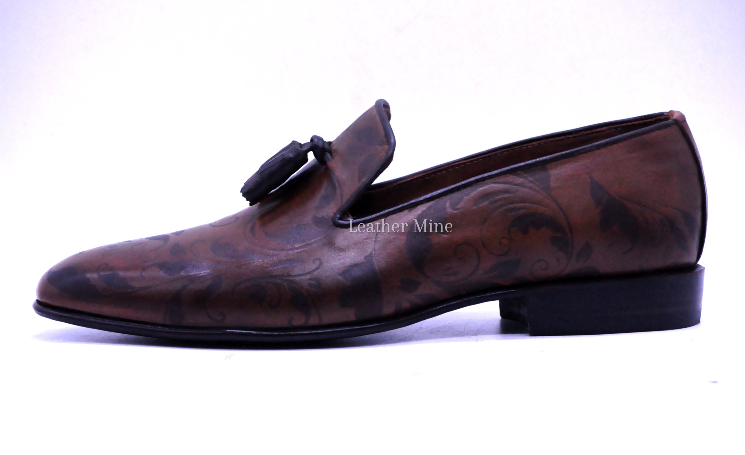 Brown Leather Floral Loafers shoes Men's, Handmade Formal Custom Shoes