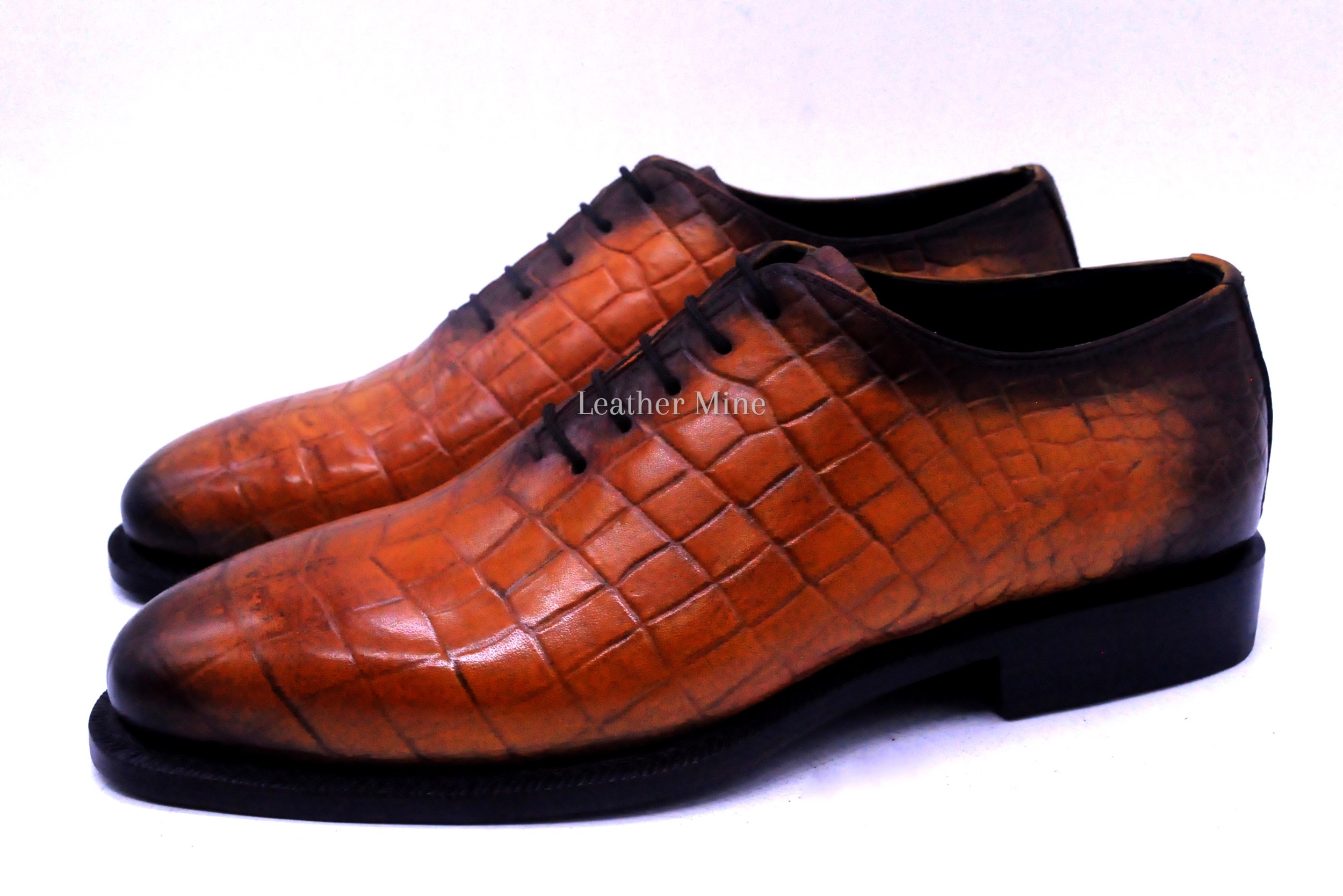 Men's Handmade Tan Patina Croc Leather Oxfords Formal Custom Made Shoes