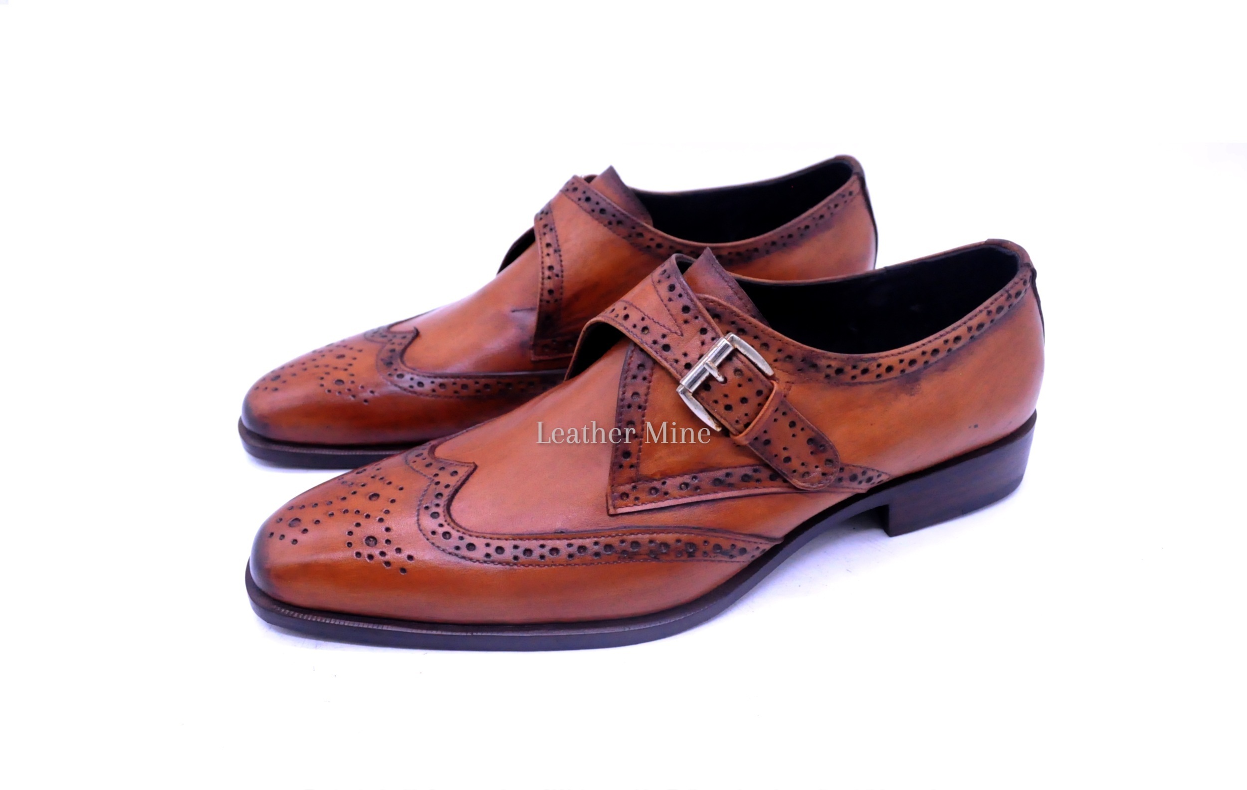 Leather Tan Wingtip Monk shoes Men's, Handmade Formal Custom Shoes