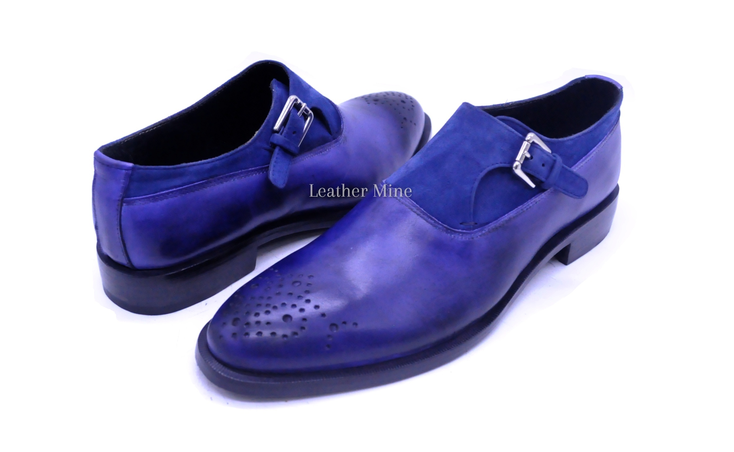 Blue Patina Monk Strap Dress Shoes For Men, Genuine Leather Custom Shoes