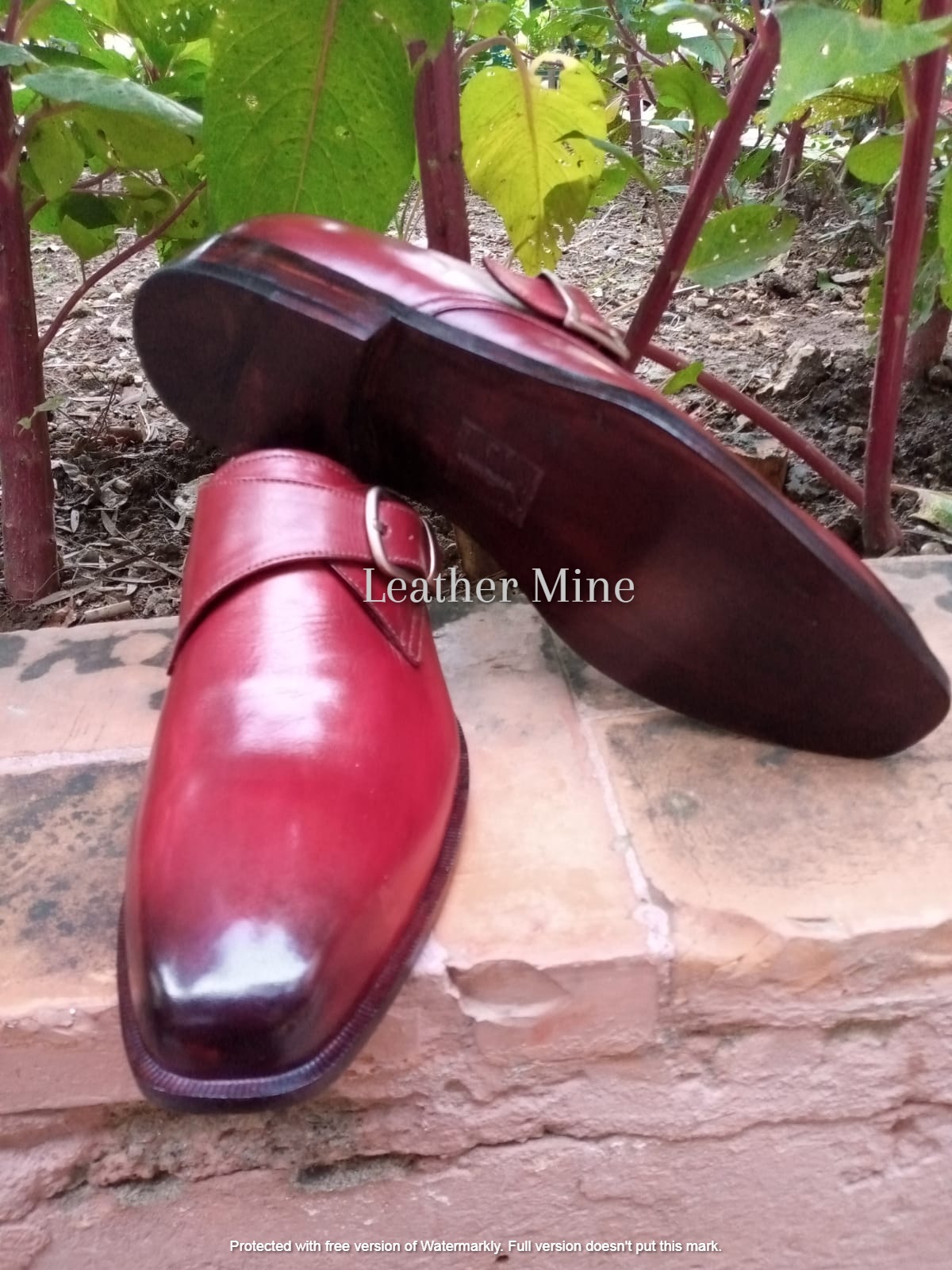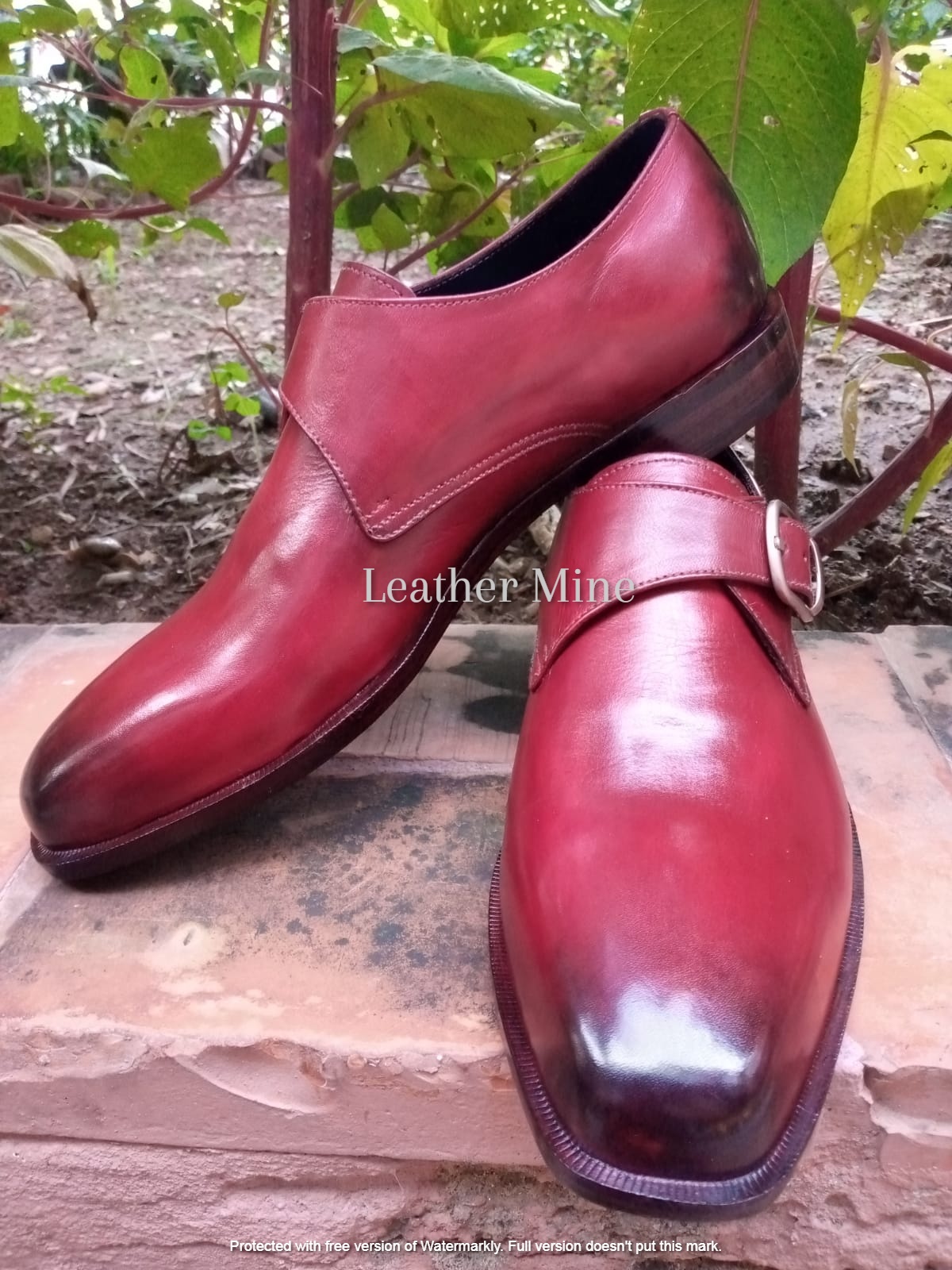 Leather Dress Shoes Men's Handmade Burgundy Patina Monk Strap Shoes