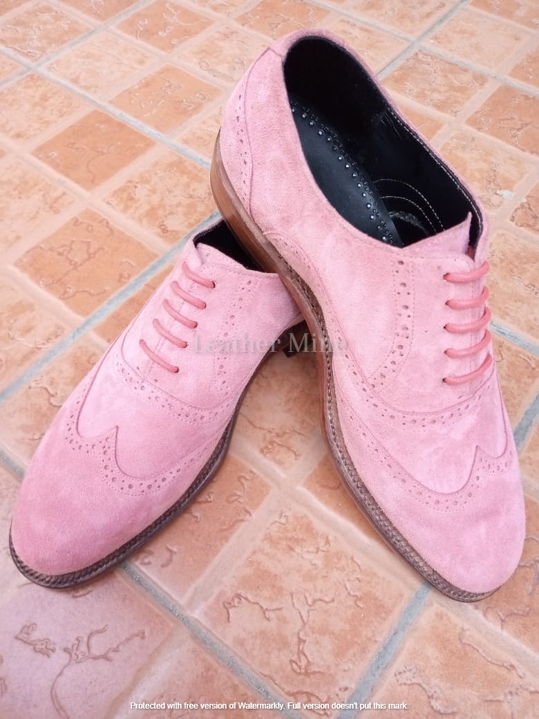 Handmade Pink Suede Wingtip Dress Shoes, Genuine Leather Formal Shoes
