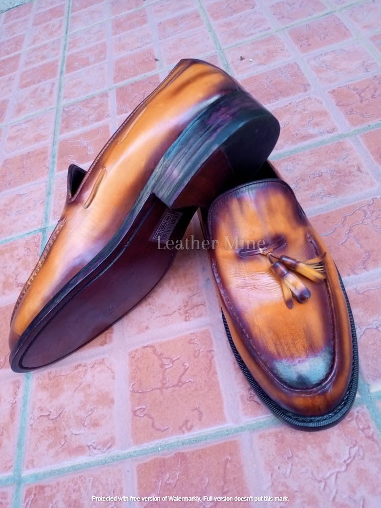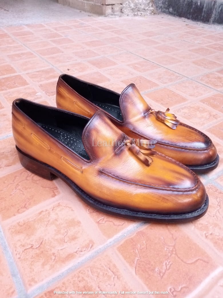 Men's Tan Patina Loafers Shoes, Handmade Genuine Leather Shoes