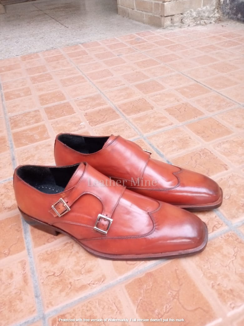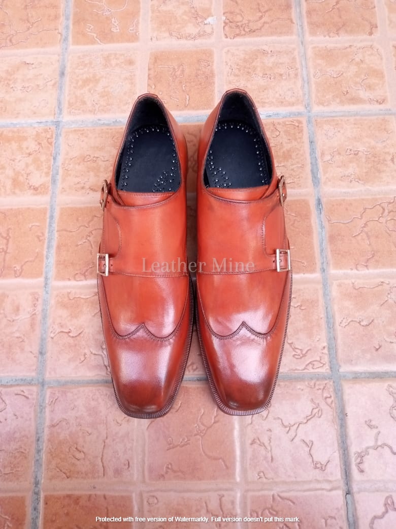 Men's Tan Double Monk Shoes, Handmade Genuine Leather Shoes