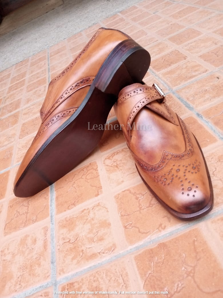 Men's Tan Brogue Monk Shoes, Handmade Genuine Leather Shoes