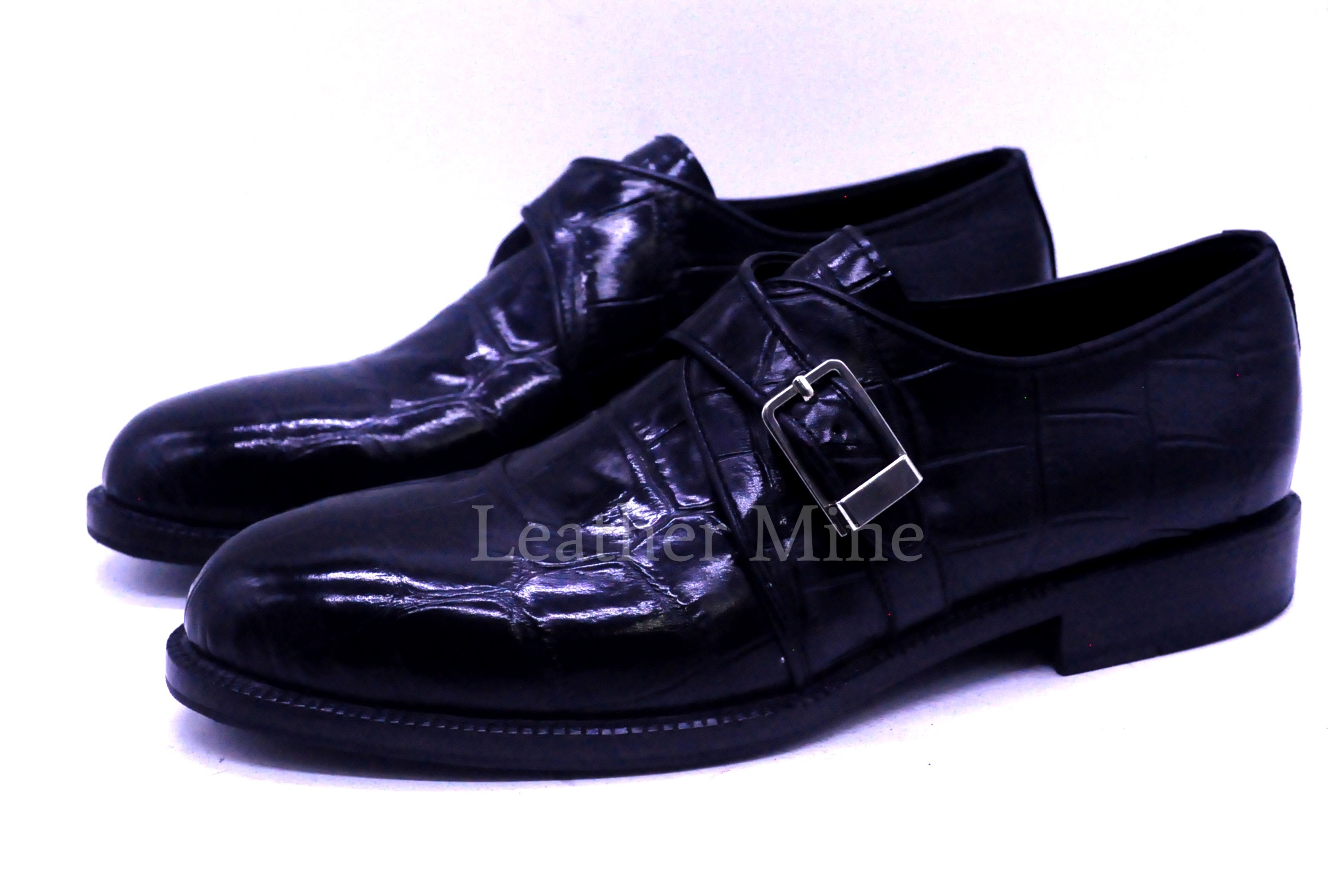 Handmade Black Croc Monk Dress Shoes, Custom Made Shoes