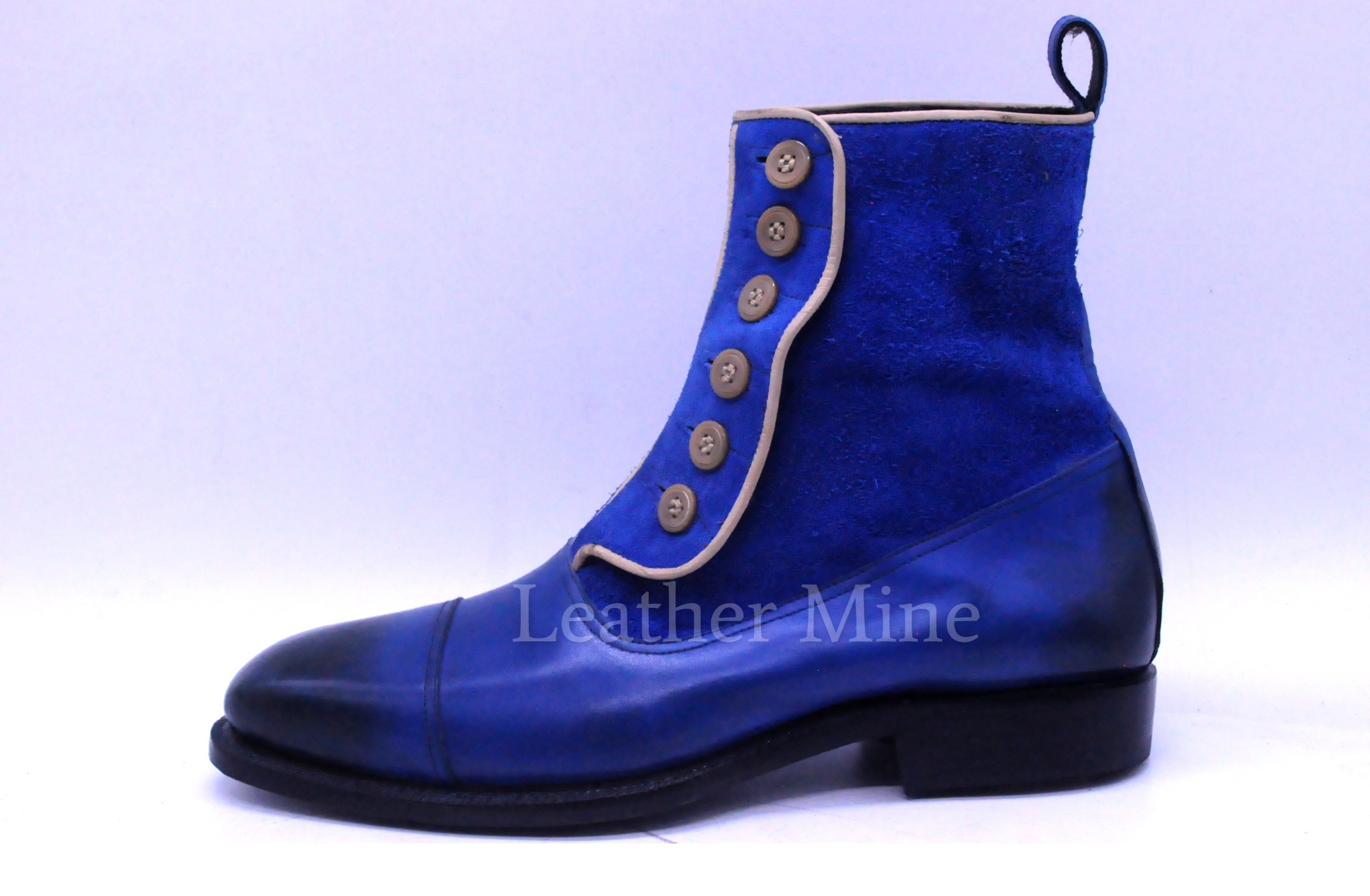 Men's Blue Button Boots, Handmade Genuine Leather Formal Boots