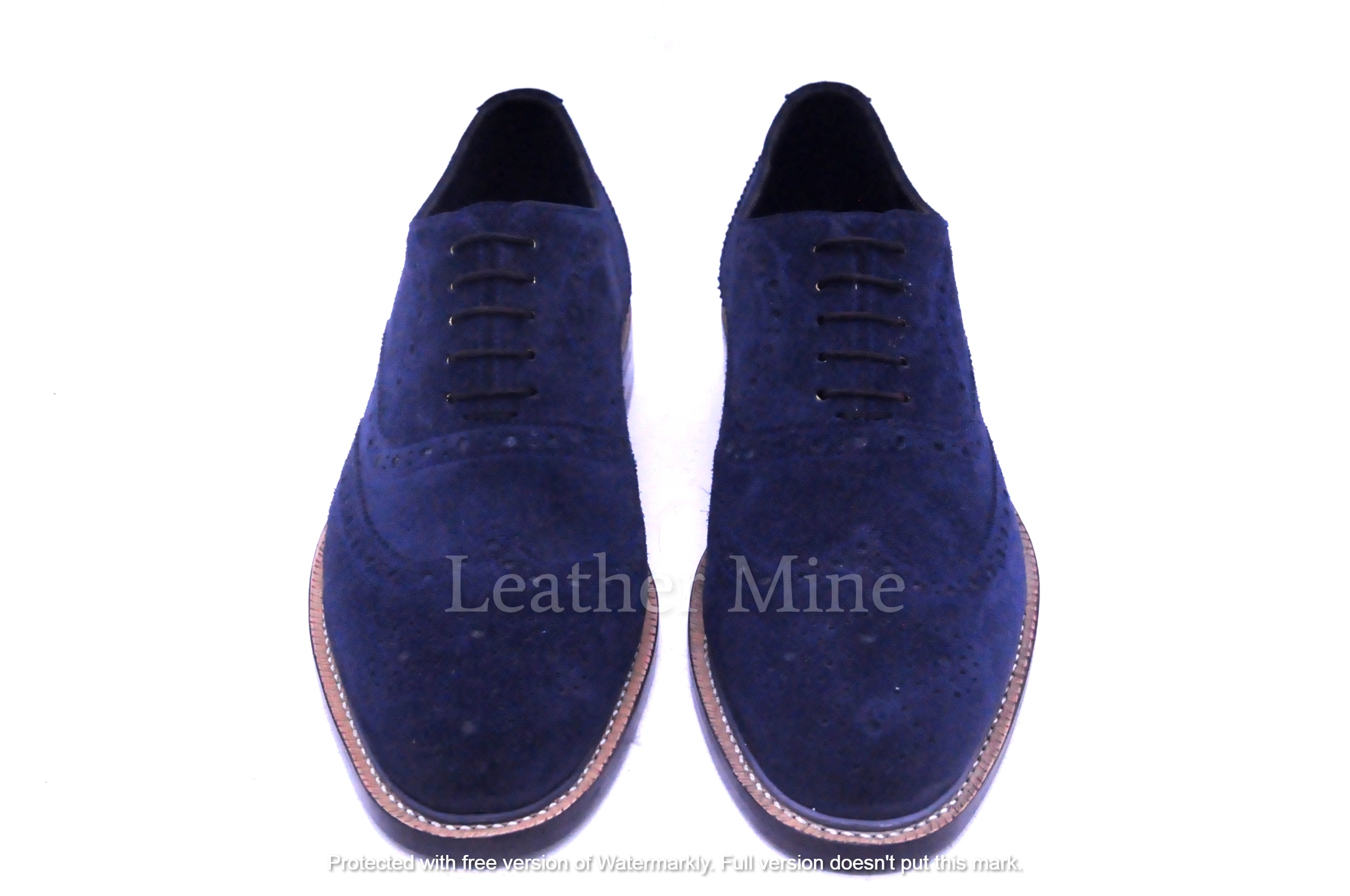 Blue Suede Wingtip Dress Shoes Men, Handmade Leather Shoes For Men