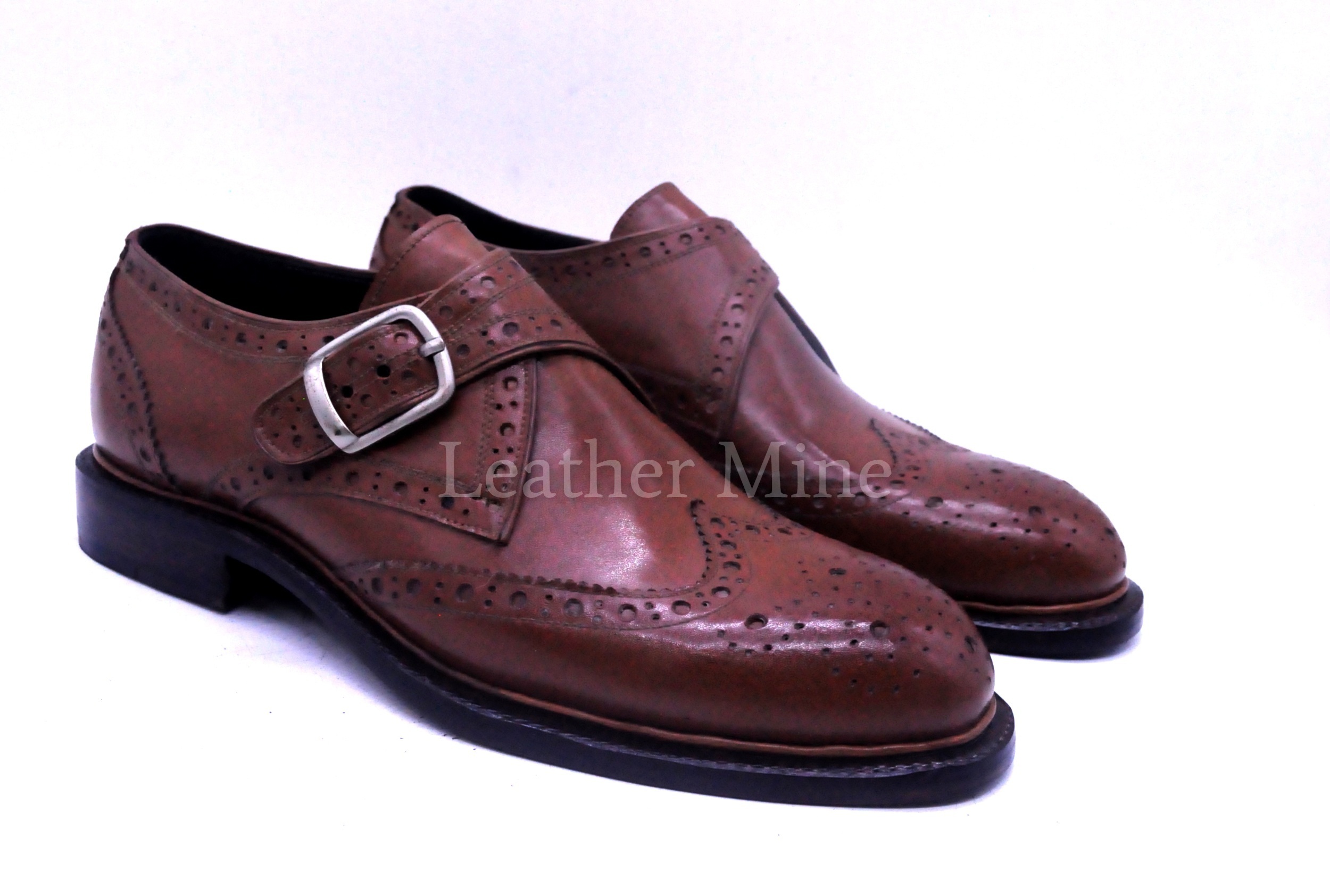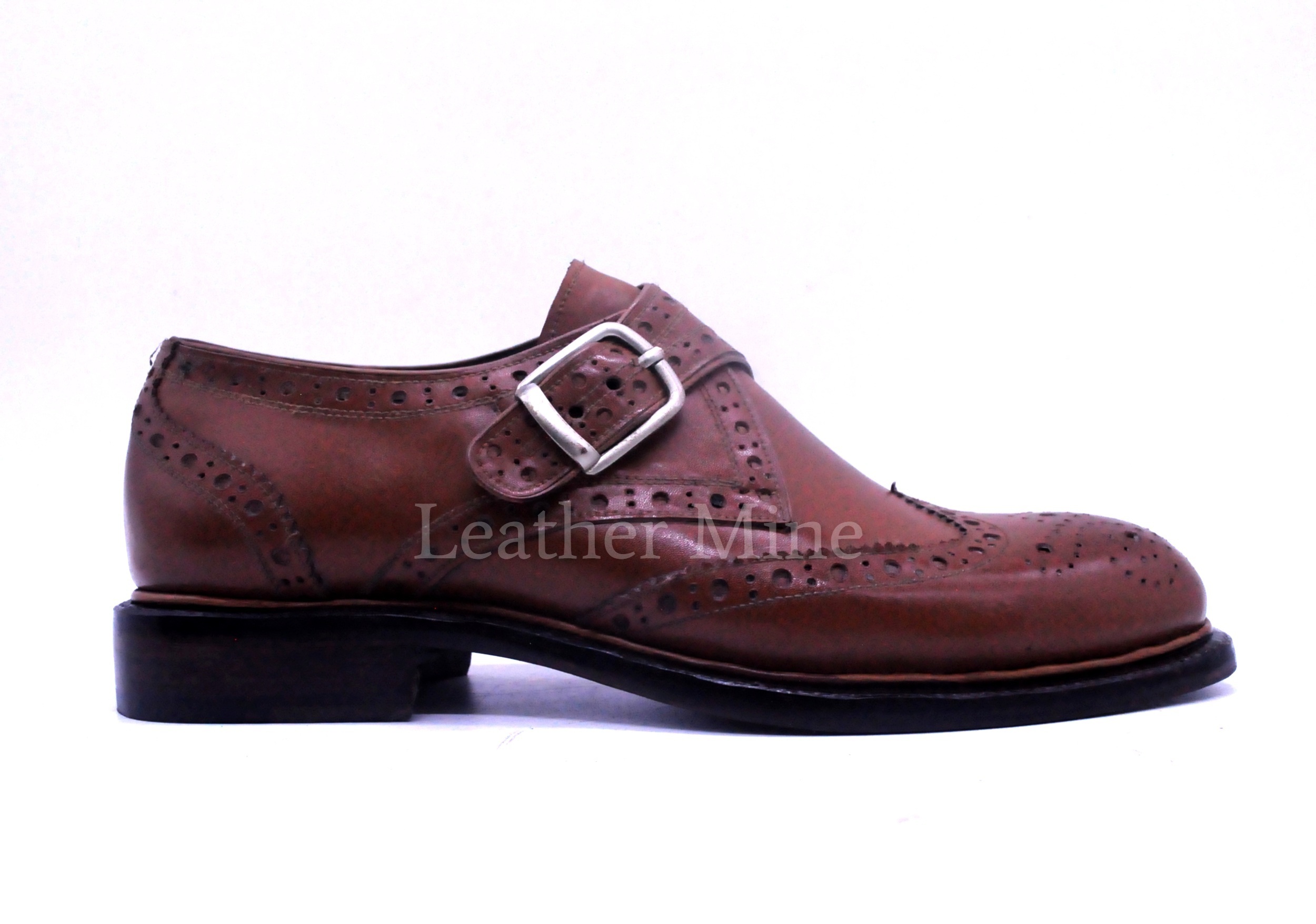 Best Handmade Leather Dress Shoes For Men, Tan Brogue Monk Shoes