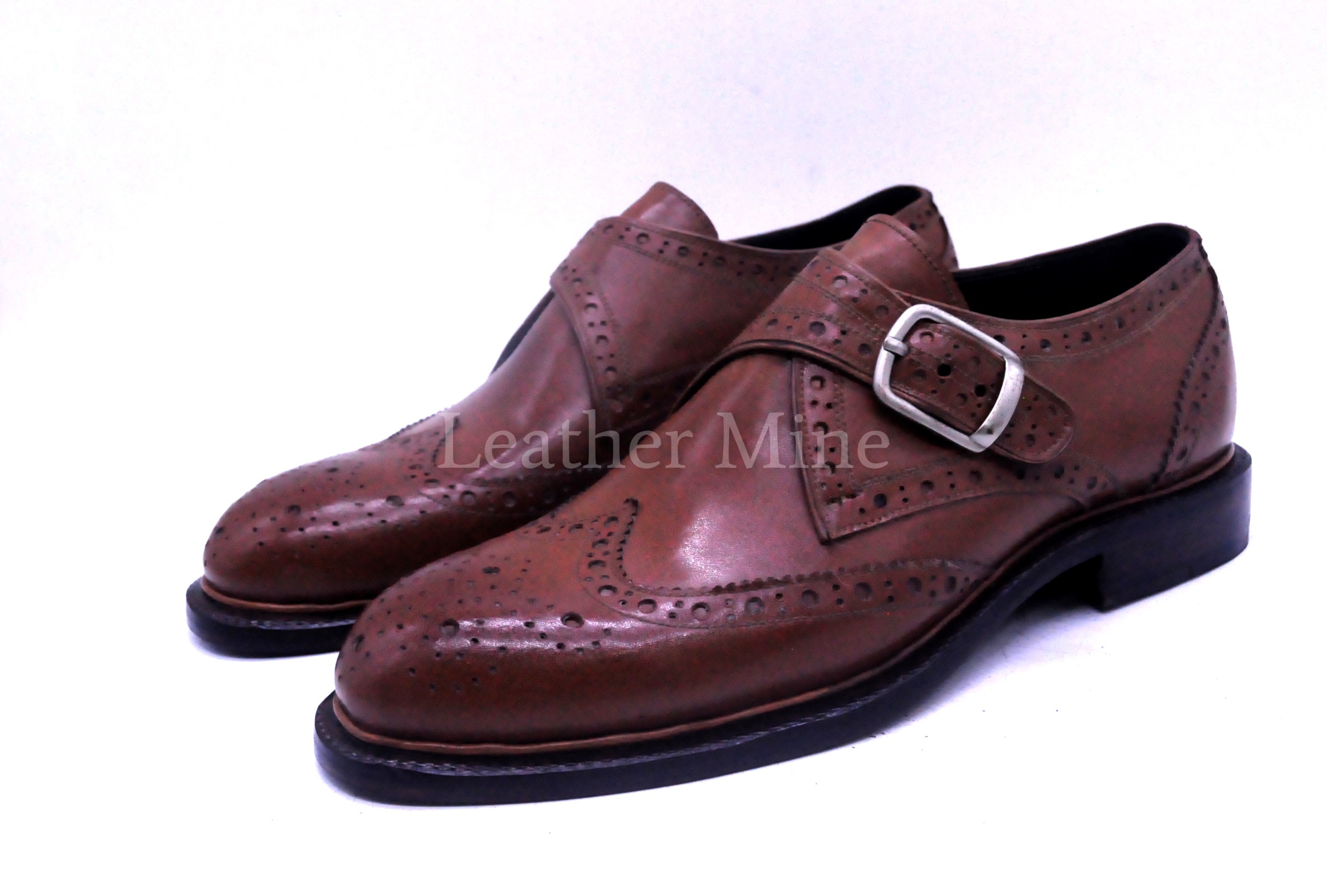 Tan Brogue Monk Dress Shoes Men, Handmade Leather Shoes For Men