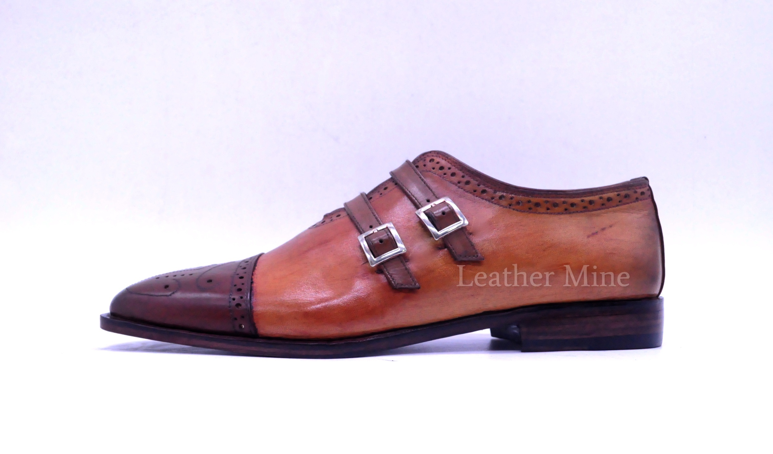 Men's Tan Patina Double Monk Shoes, Handmade Genuine Leather Shoes