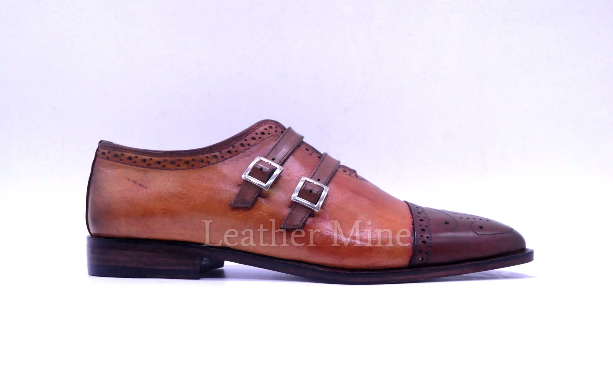 Best Handmade Leather Shoes For Men, Tan Patina Double Monk Shoes