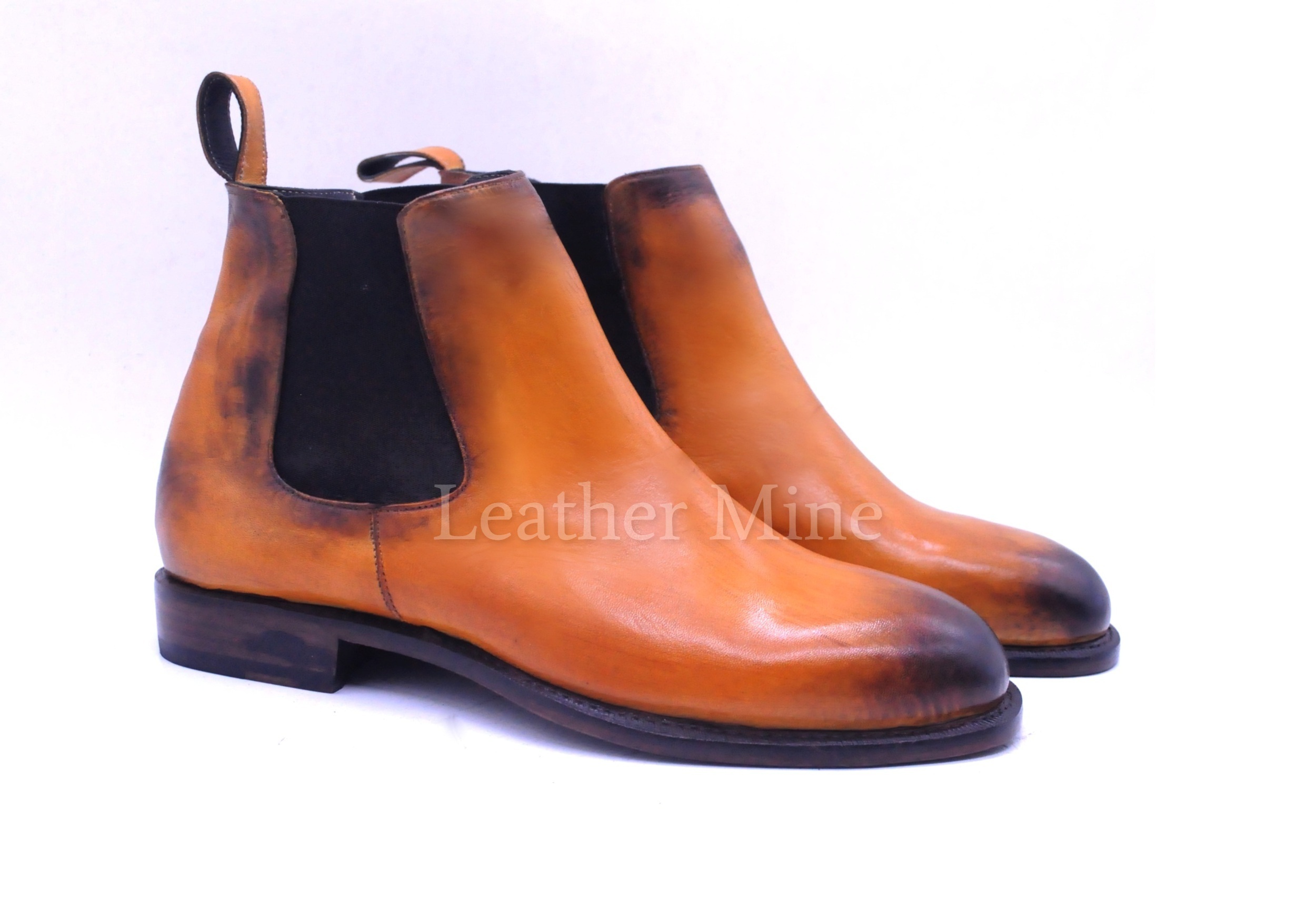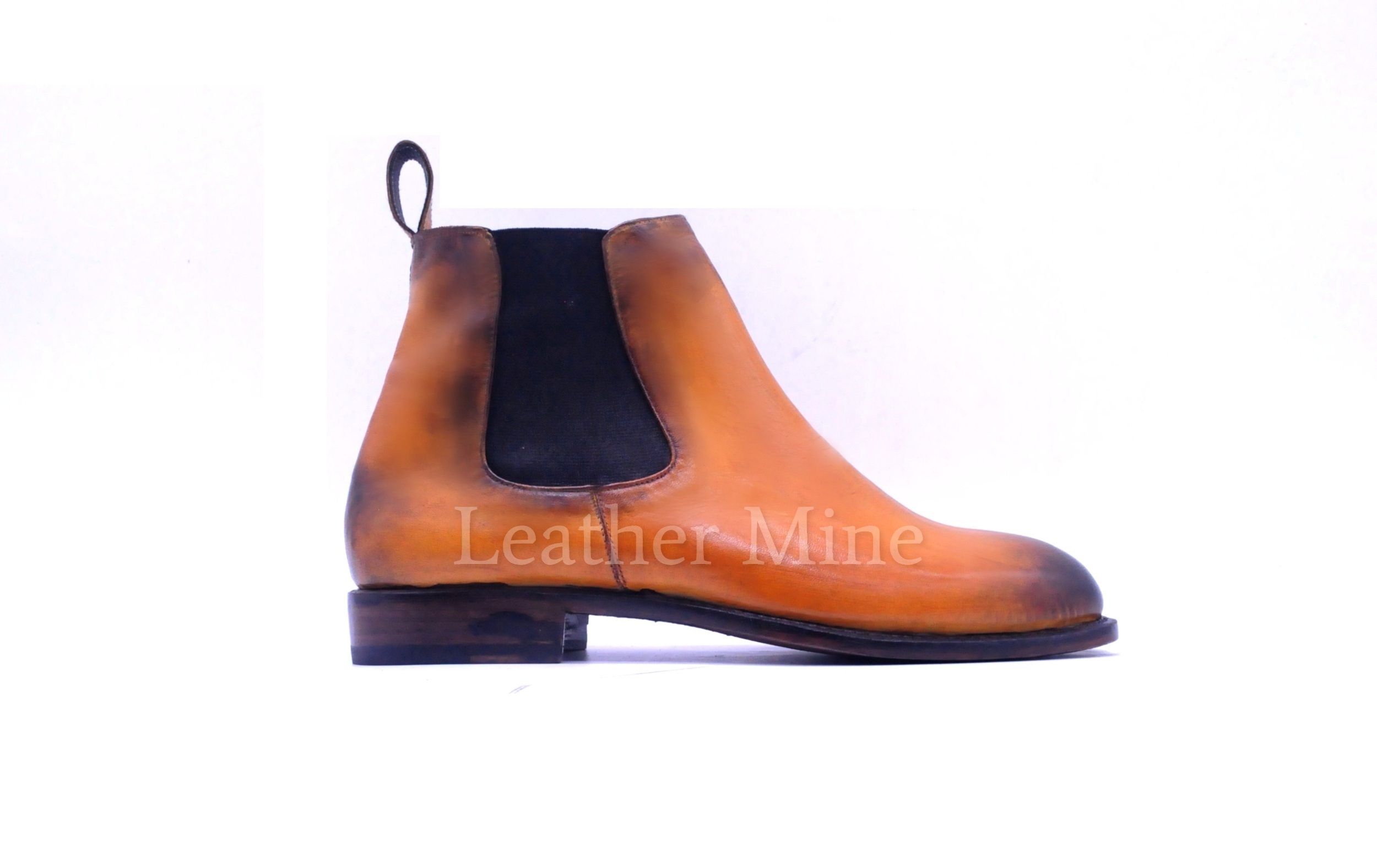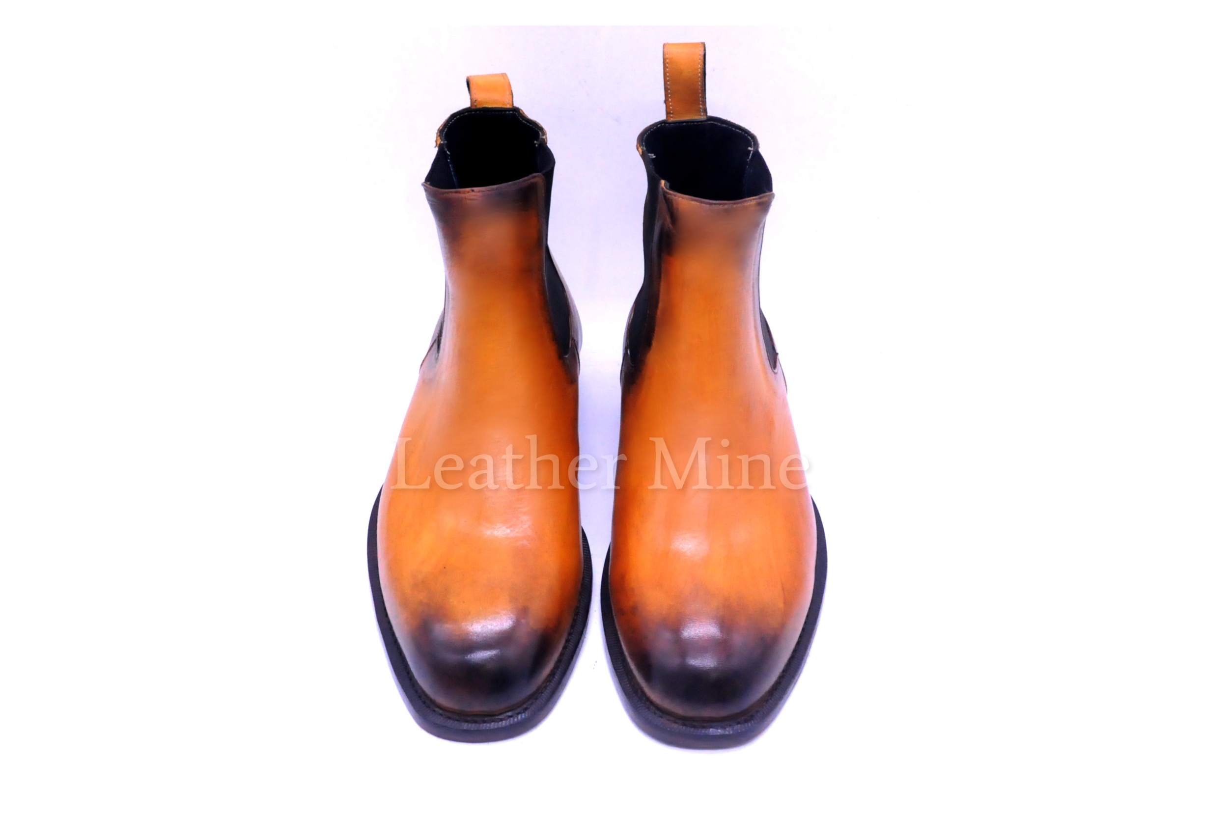 Best Handmade Leather Dress Boots For Men, Tan Patina Chelsea Boots