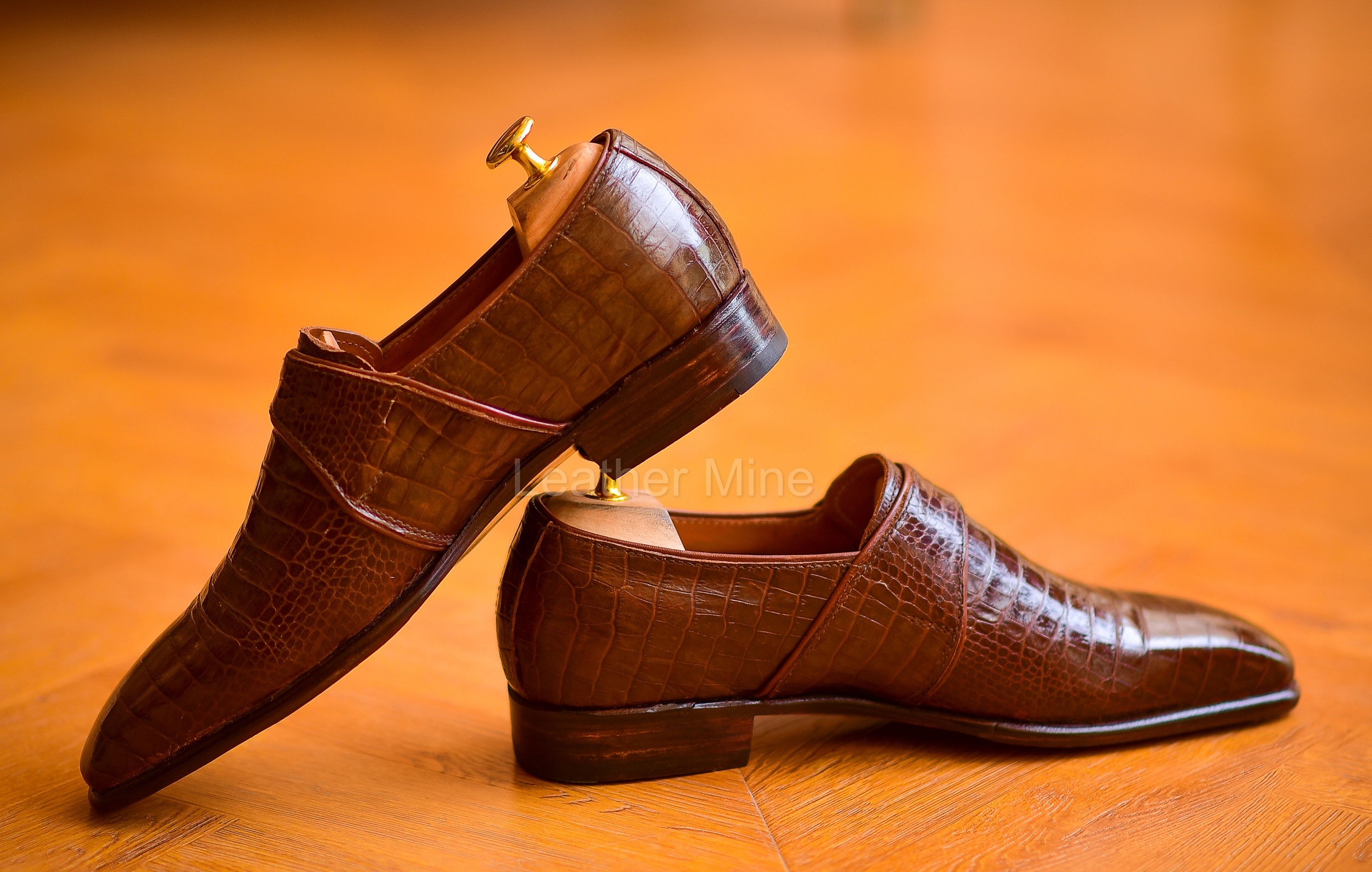 Brown Crocodile Monk Leather shoes Men's, Handmade Leather Shoes